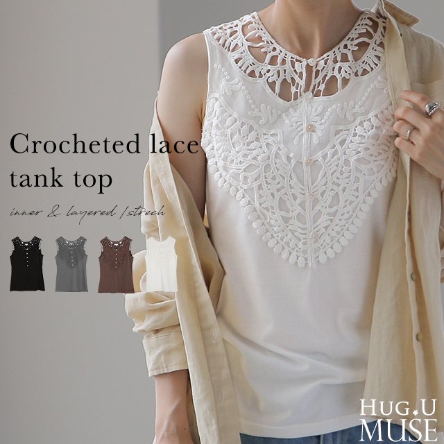 インナー シアー 袖なし 重ね着 きれいめ レースネック レースキャミソール キャミソール キャミ カットソー 着回し 薄手 薄め ベーシック スタンダード シースルー キレイめ 透け レースタンクトップ シンプル 無地 バックシャン バックコンシャス ボタン ブラック グレー ホワイト モカ ブラウン 黒 黒色 灰色 茶 茶色 白 白色 20代 30代 40代 50代 おしゃれ 母の日 お洒落 オシャレ かわいい 可愛い カワイイ ハグユー HUG.U HUGU