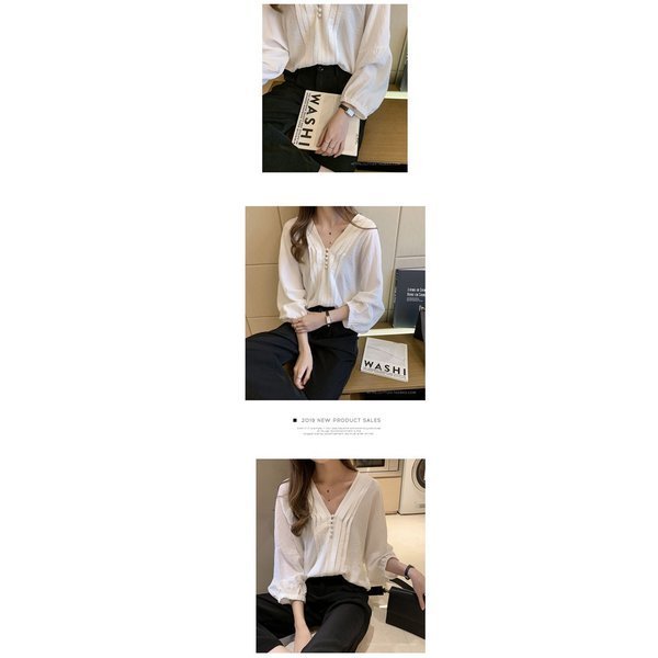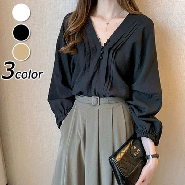 ブラウス レディース 20代30代40代 vネック Tシャツ トップス 長袖 プリーツ 韓国風 上品 大きいサイズ オシャレ 3色 通勤 着痩せ パフスリーブ 新作