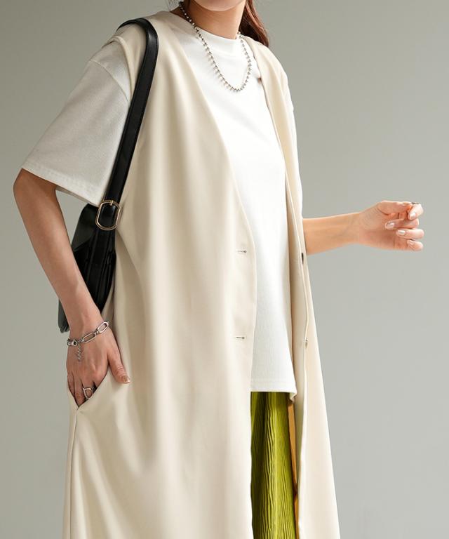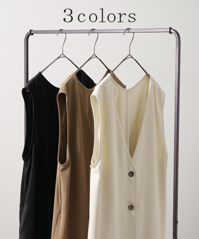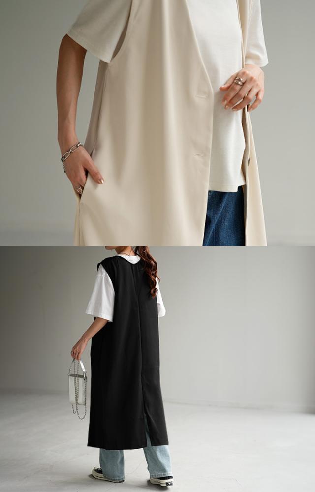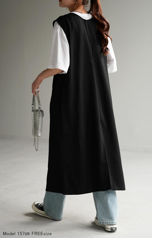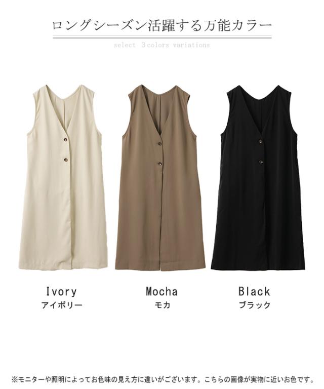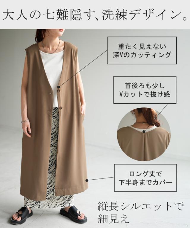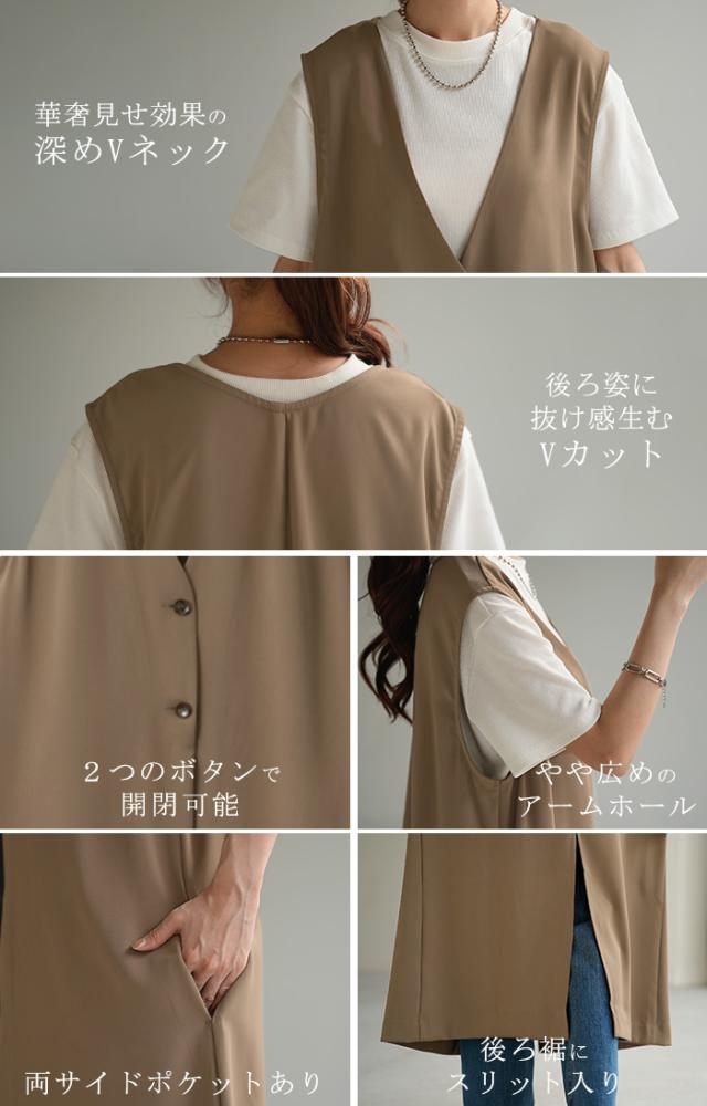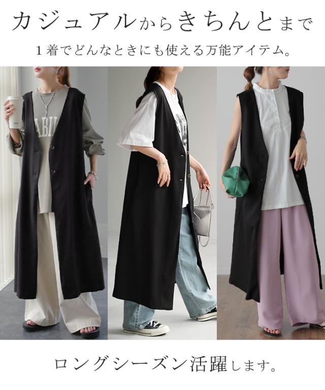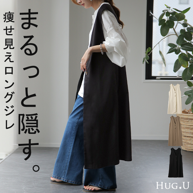 ベスト ジレ レディース トップス ロングベスト 薄手 ロングジレ 前開き レイヤード スリット お洒落 ロング 体型カバー ブラック 黒 大きいサイズ ノーカラ— Vネック 深V お尻が隠れる アウター 羽織 きれいめ HUG.U 冬 秋 秋新作