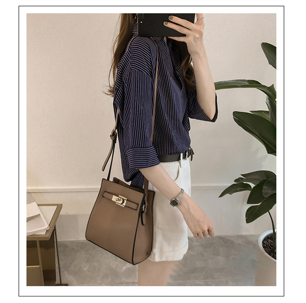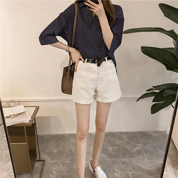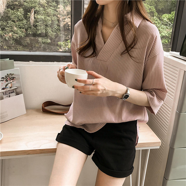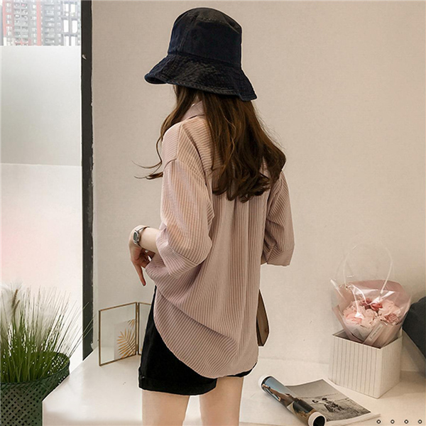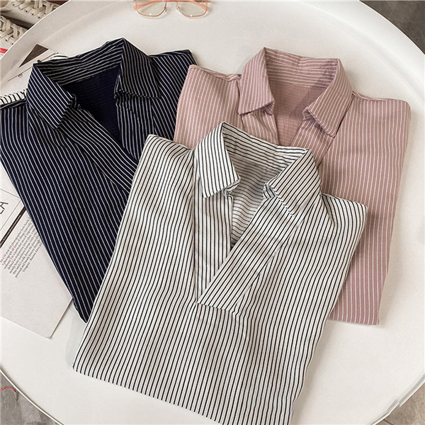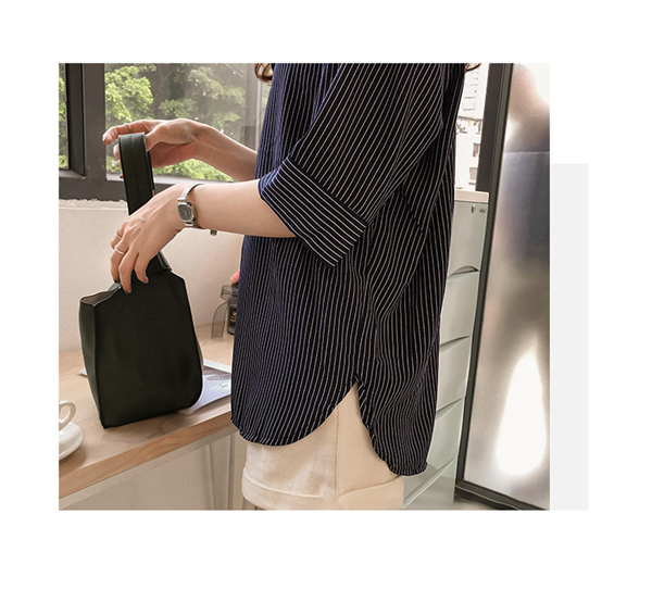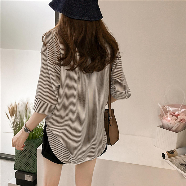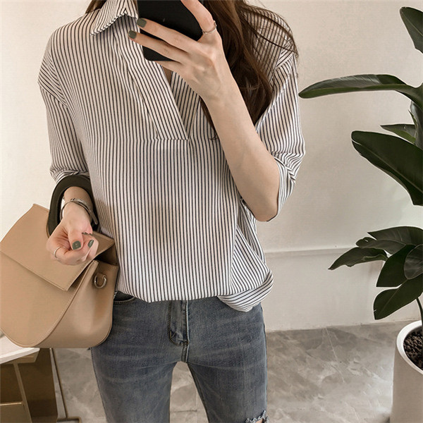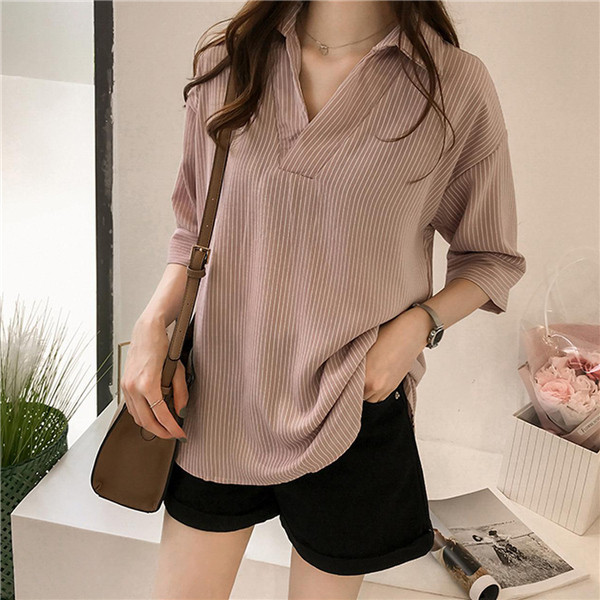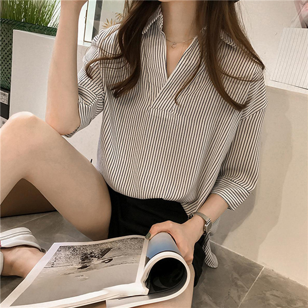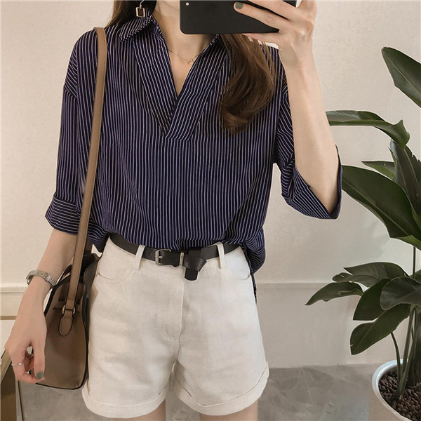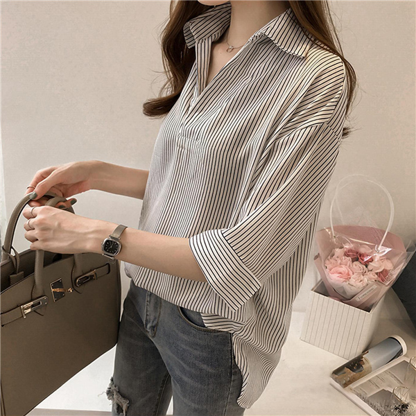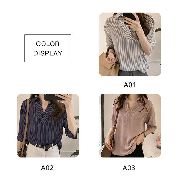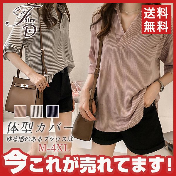 シャツ ブラウス レディース オフィス ストライプ 七分袖 無地 ゆったり 襟付き 大きいサイズ 体型カバー 綿混 夏 トップス きれいめ