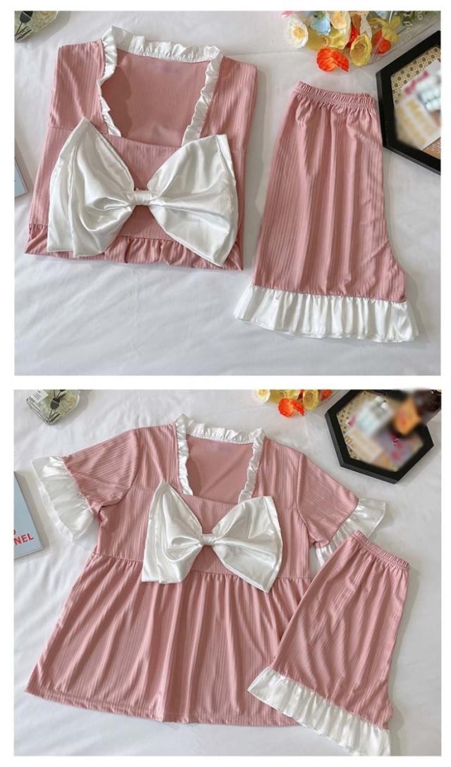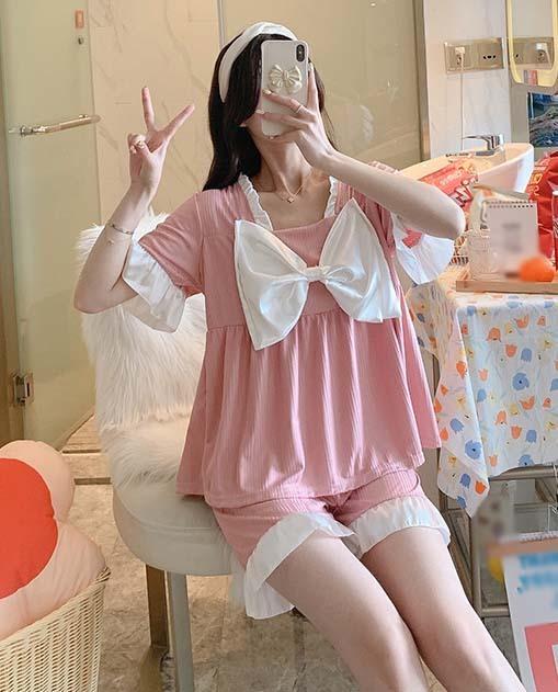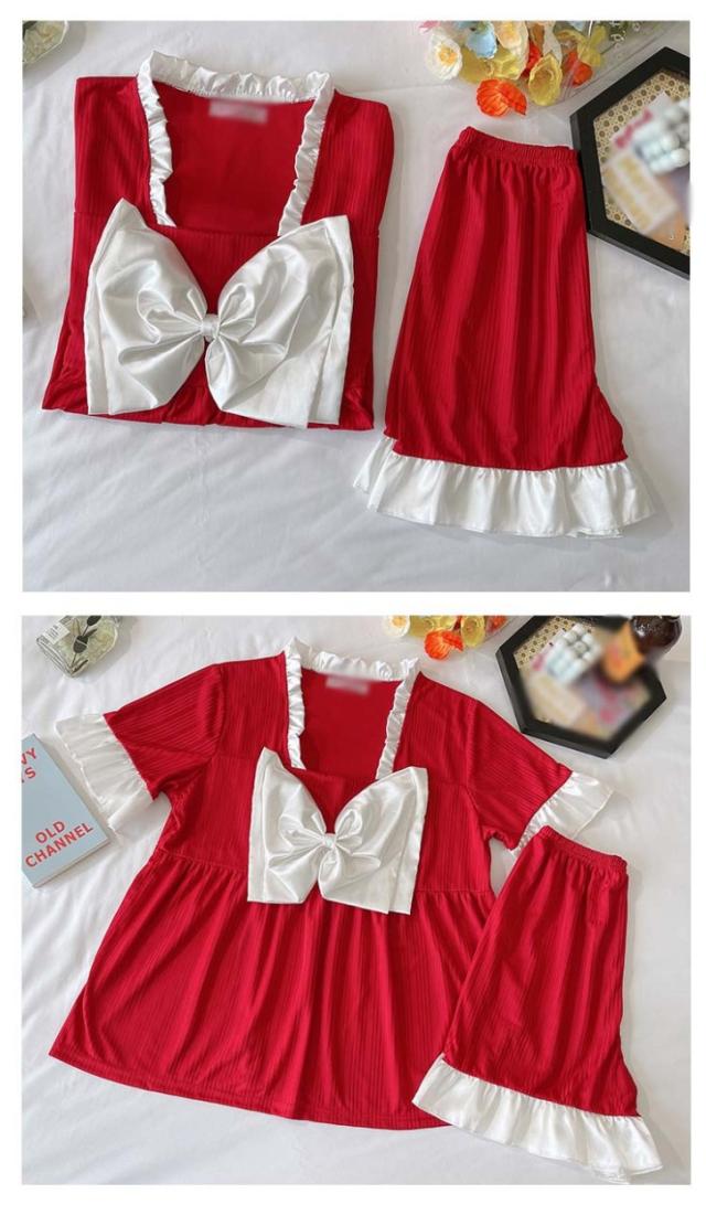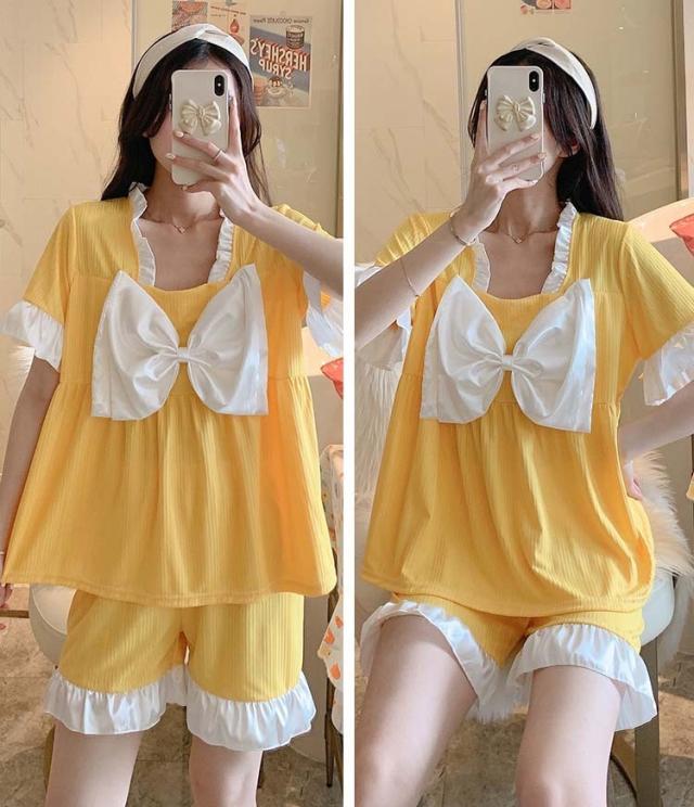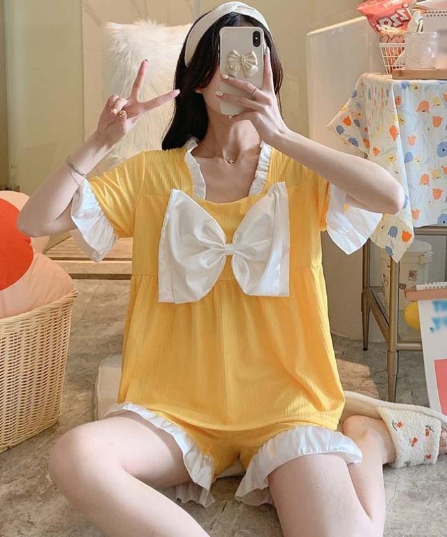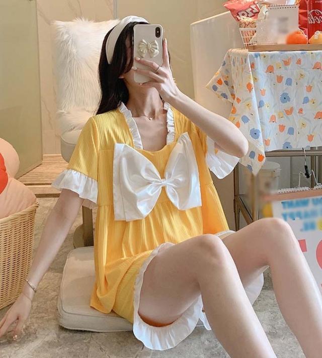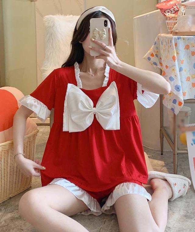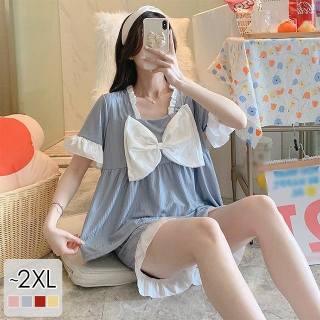 ナイトウェア ルームウェア パジャマ 部屋着 レディース リラックスウェア 半袖 フリル リボン 無地 ブルー ピンク レッド イエローエレガント