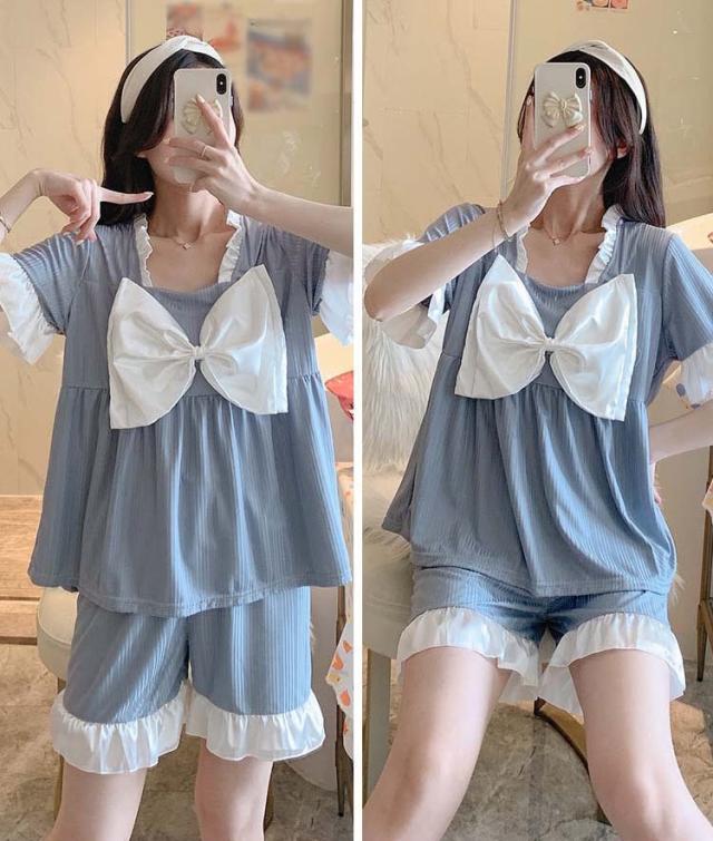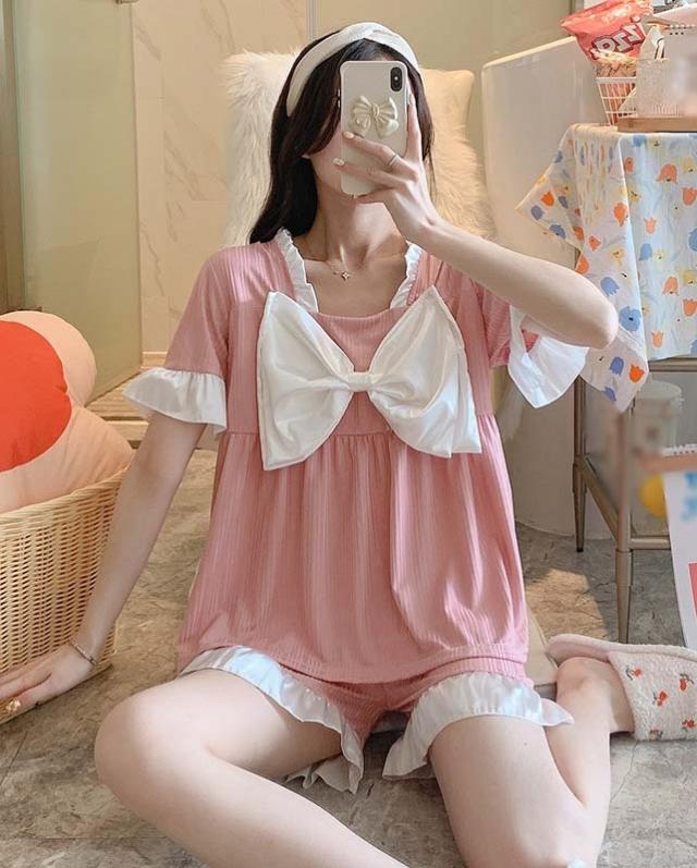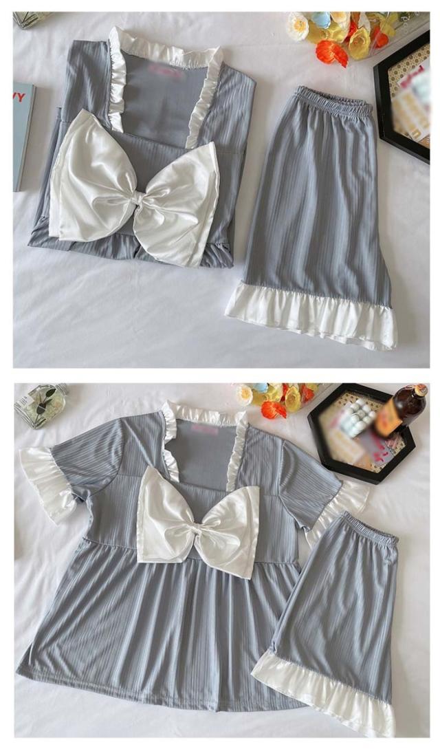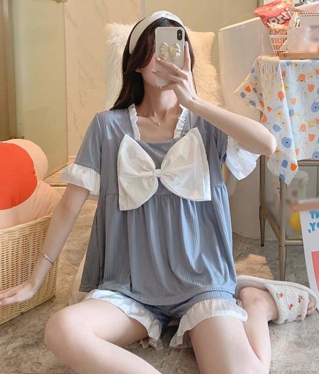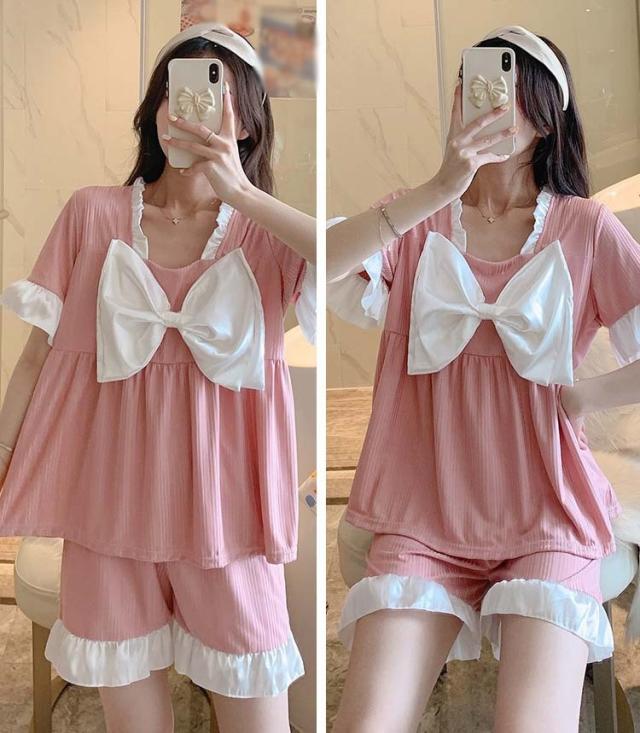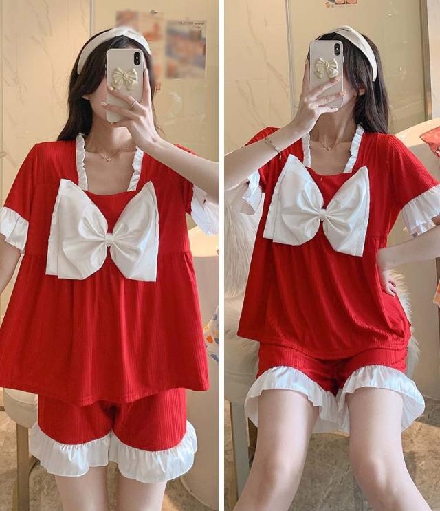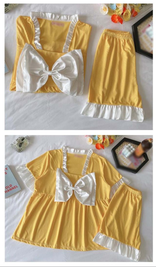 ナイトウェア ルームウェア パジャマ 部屋着 レディース リラックスウェア 半袖 フリル リボン 無地 ブルー ピンク レッド イエローエレガント