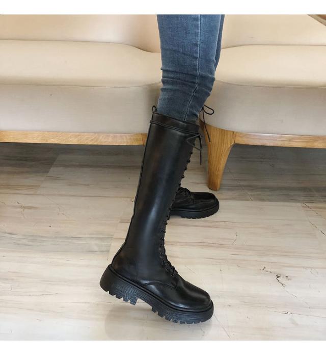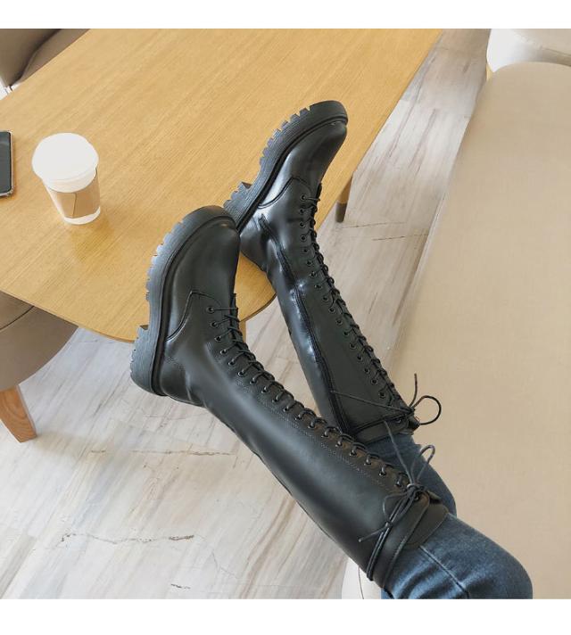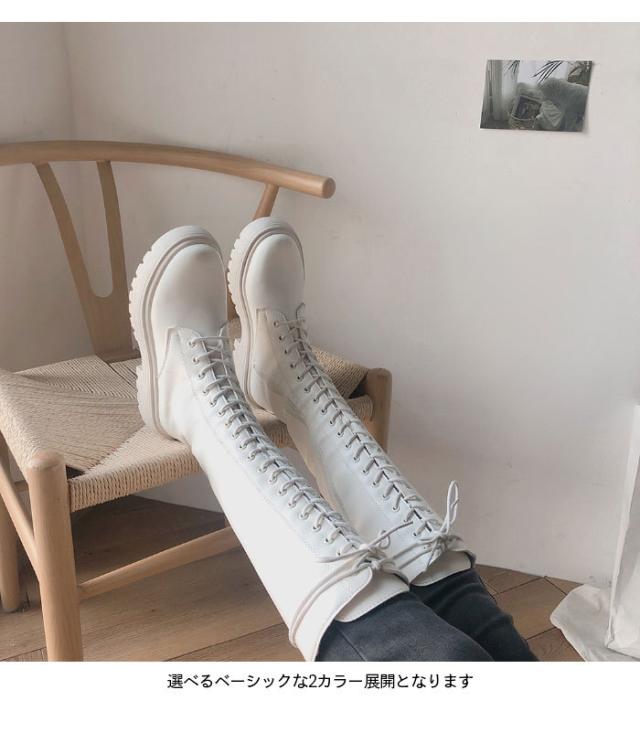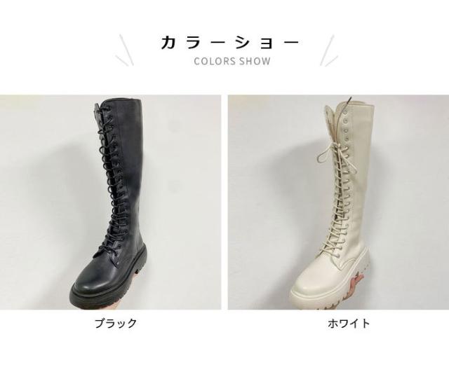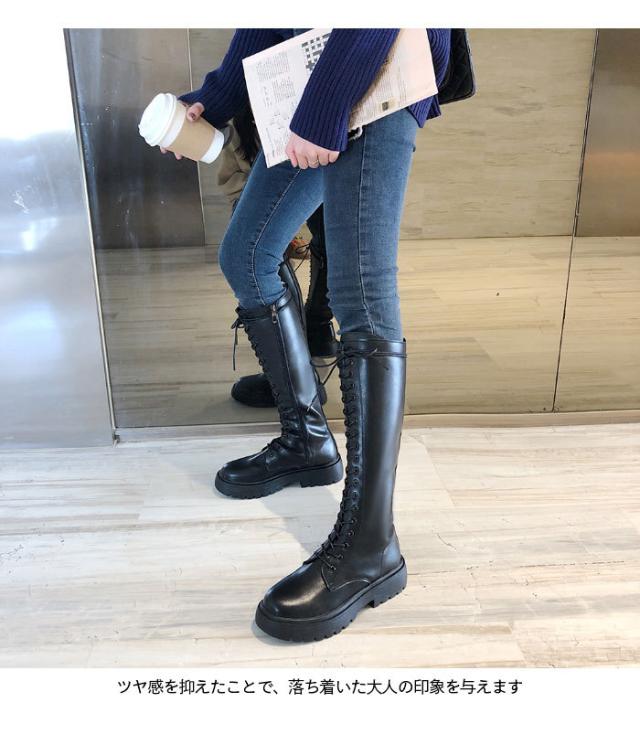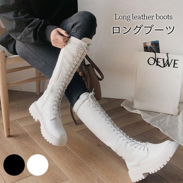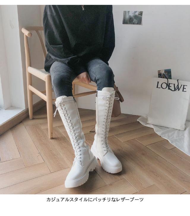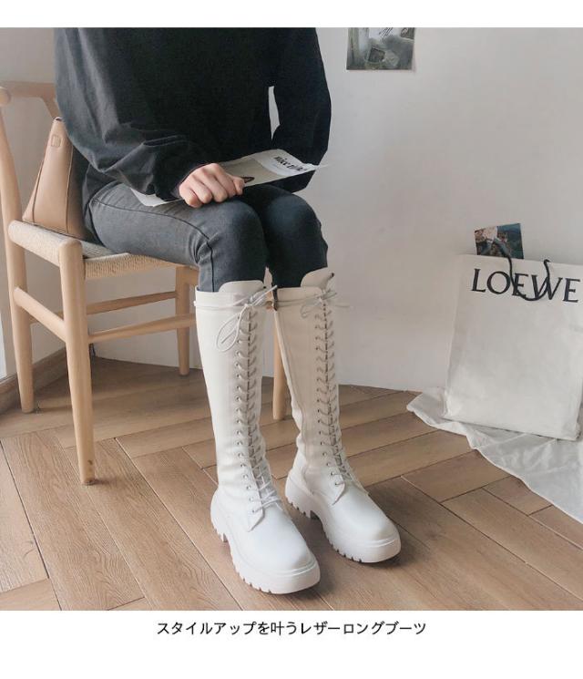 ロングブーツ レディース ブーツ レースアップ レザーブーツ 編み上げ PUレザー フェイクレザー ハイブーツ 厚底 光沢感 柔軟性 美脚