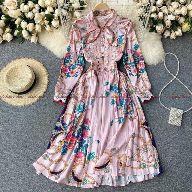 ボヘミアンレトロパレススタイルプリントVネックボウ長袖スリムスリミングラグジュアリーハイエンドドレス