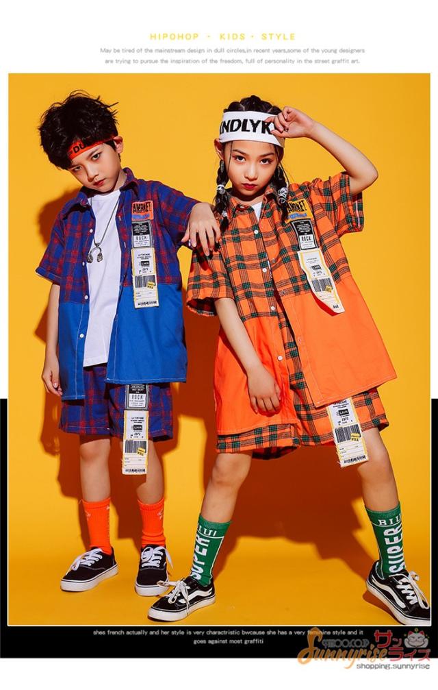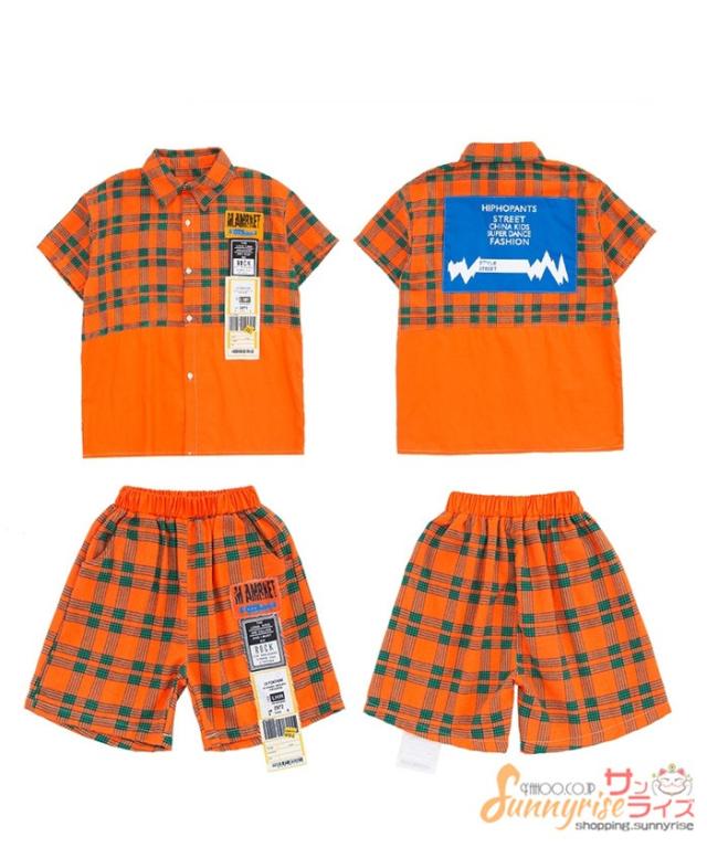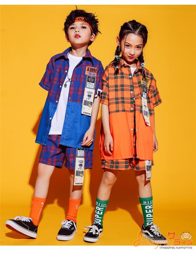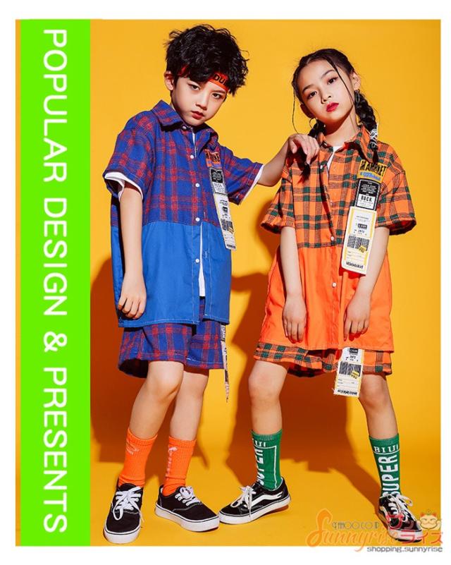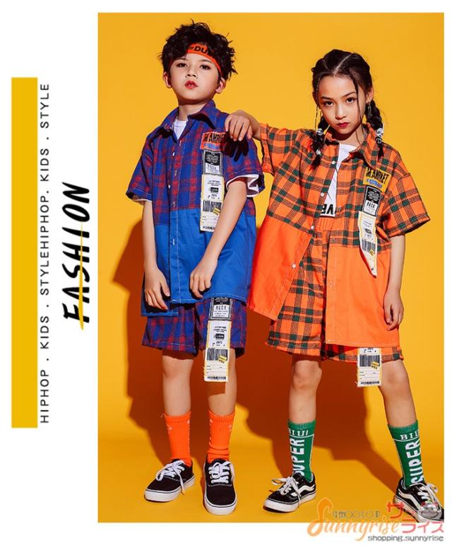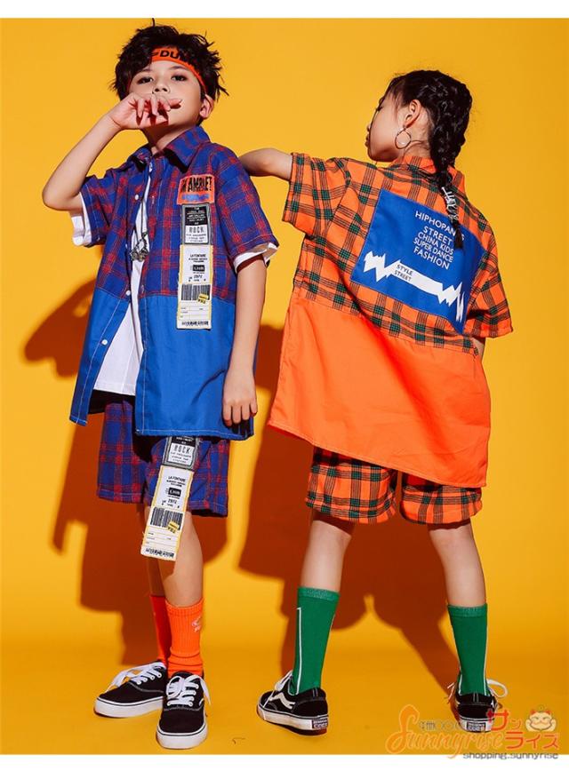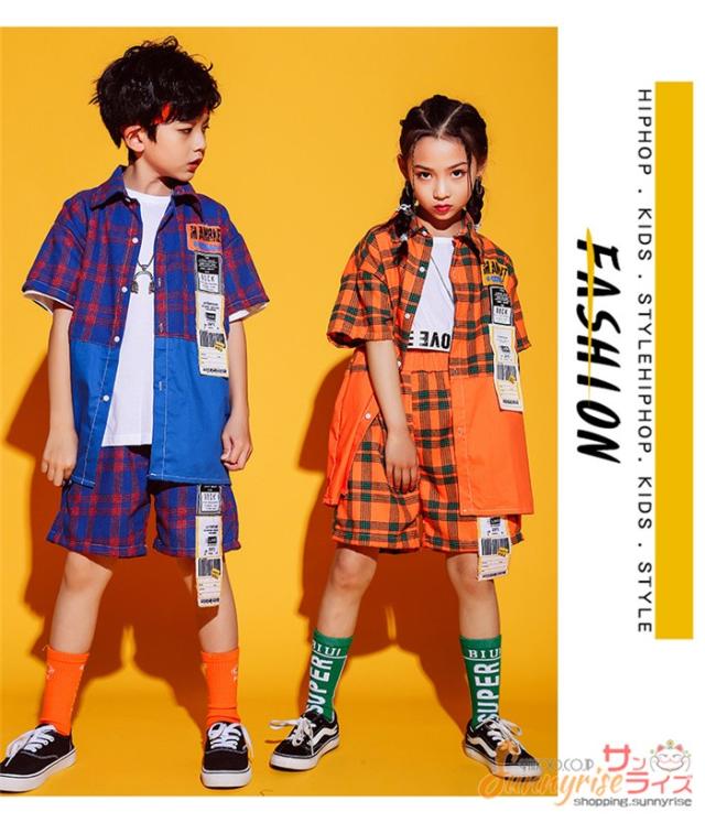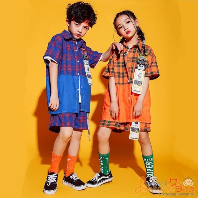 キッズ ダンス衣装 HIPHOP ヒップホップ トップス HIPHOP ダンス 衣装 キッズ 原宿系 チェック柄 シャツ パンツ ジャズ 練習着 体操服 応援団