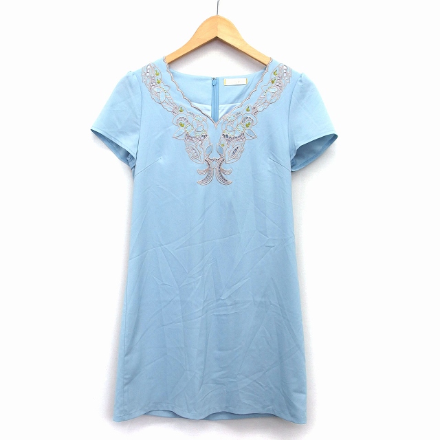 【中古】チェリーアン Cherry Ann ワンピース ミニ Vネック 半袖 刺繍 花 柄 ビーズ装飾 フリル S ライトブルー 青