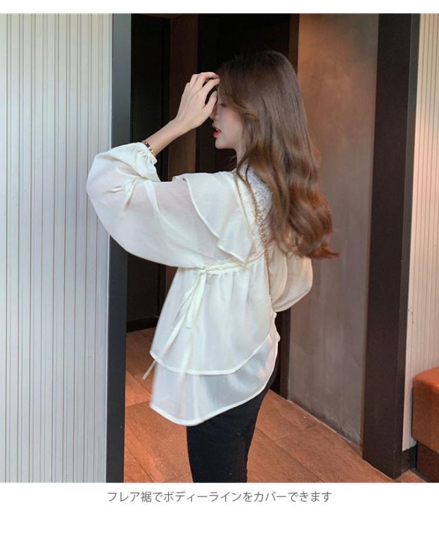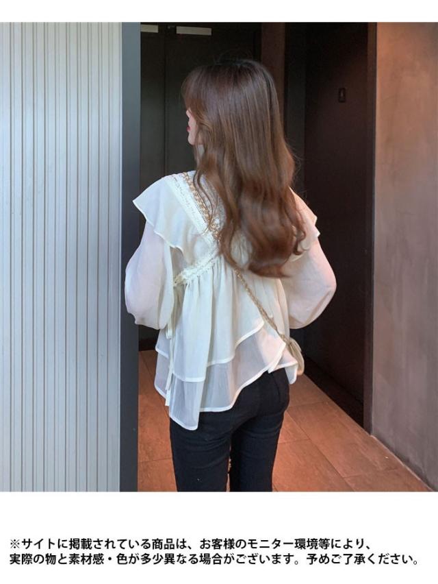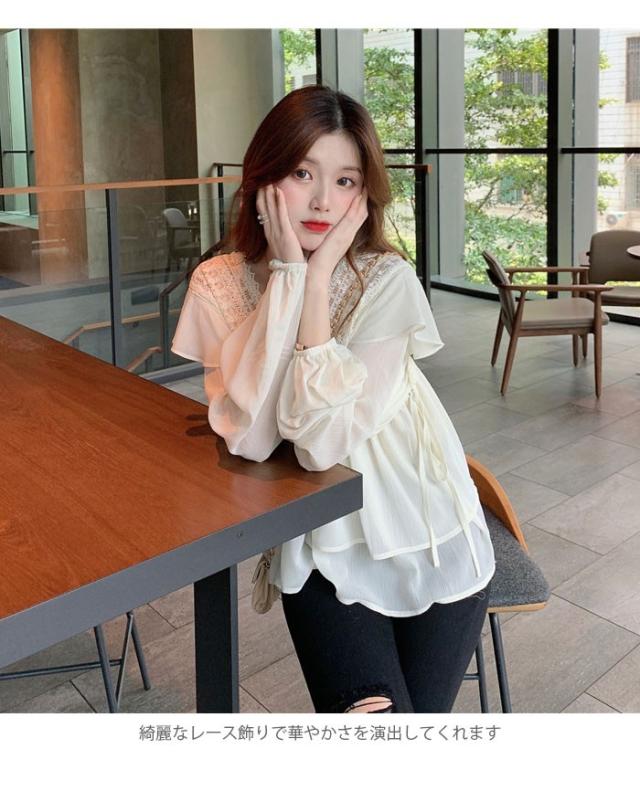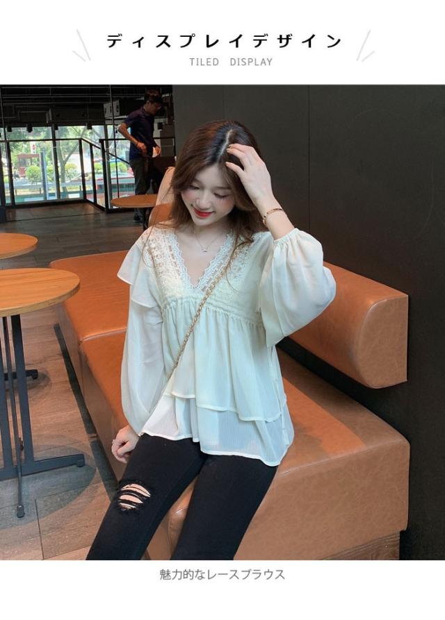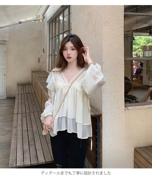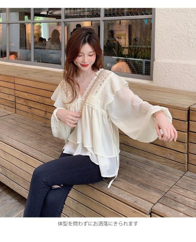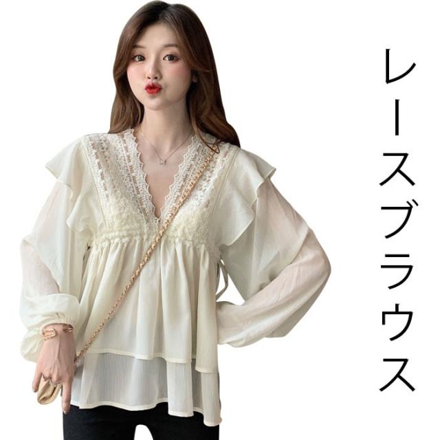 レースブラウス レディース シフォン ブラウス 長袖ブラウス フレアブラウス Vネック 清楚 優雅 体型カバー エレガント フェミニン お洒落 キレイめ 夏新作