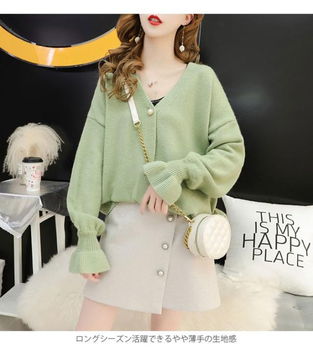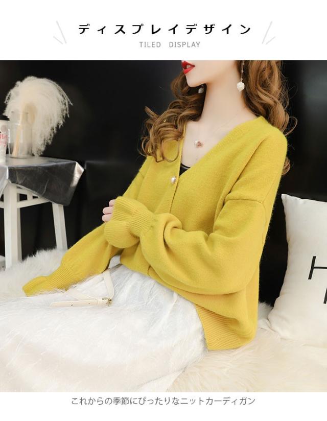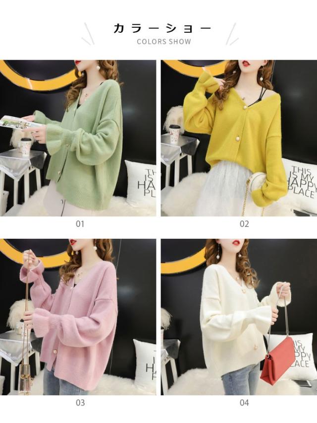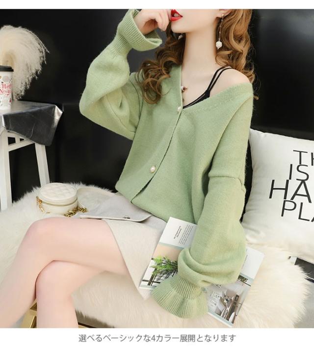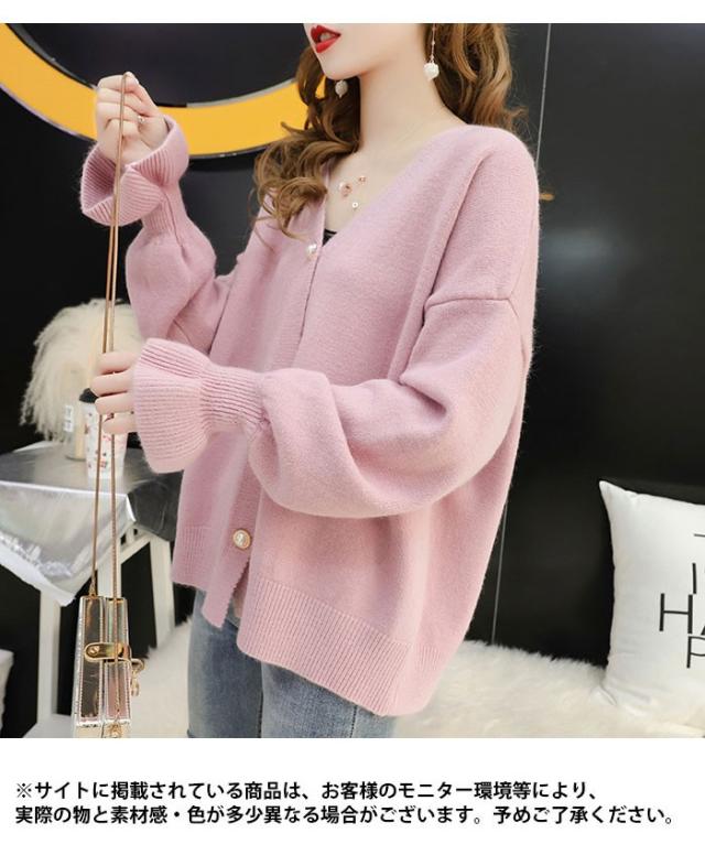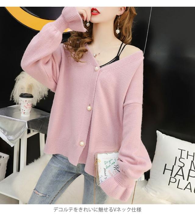 ニットカーディガン レディース カーディガン リブニット ビジューボタン フェイクビジュー Vネック 長袖 ゆったり ドロップショルダー 薄手 秋新作