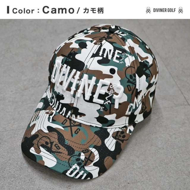 DIVINER GOLF(ディバイナーゴルフ)『カモ柄キャップ』【オリジナルカモ柄キャップ】■Design/デザイン「DIVINER GOLF」オリジナルのカモ柄を用いたスポーツキャップ。フロント部分にはブランドロゴを立体的に刺繍しており、デザイン性を高めている。帽子のツバの裏側にまでデザインを施しており、細部までのこだわりを感じさせる。■Fabric/素材感スポーツキャップ特有のしっかりとした素材感でキレイな形を保つことができる。またキャップのアジャスターにはストラップバッグを採用しており、自由にサイズの調節が可能。