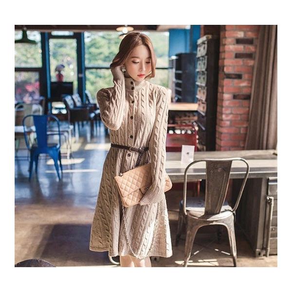 ワンピース 長袖 ニット 韓国ファッション レディース 秋冬 タートルネック ケーブル編み 体形カバードレス ベルト付 人気商品 送料無料