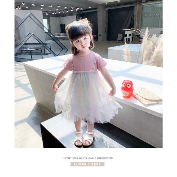 キラキラ ピカピカ レインボー色 半袖 夏ワンピ リゾートワンピ 結婚式 パーティー キッズ ワンピース 新作 夏 オシャレ