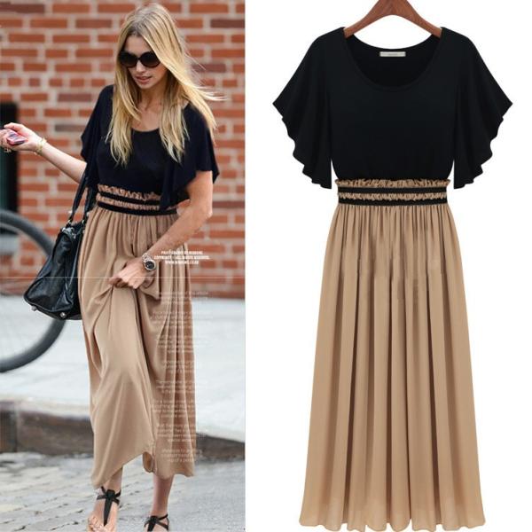 ワンピース チュニック ロング マキシ丈ワンピース 半袖 ドッキングワンピース ミモレ丈 シンプル おしゃれ シフォンワンピース 送料無料