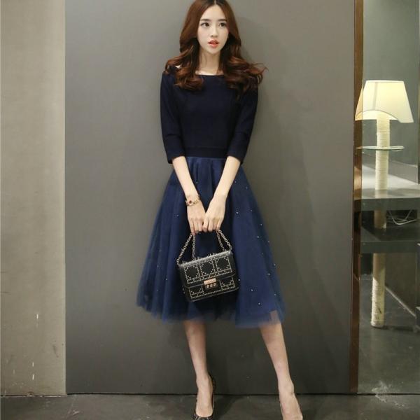 ワンピース ひざ丈 七分袖 異素材 切り替え シフォン ドット バイカラー ミモレ丈 Uネック 結婚式 二次会 パーティー ふんわり 2017