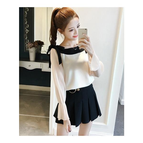 トップス シャツ ブラウス 長袖 トレンド シャツ ブラウス リボン シフォン ベルスリーブ ボリューム袖 バイカラー 肩リボン 送料無料