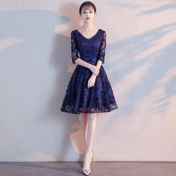 【韓国 七分袖レースパーティードレス お呼ばれワンピース 秋 冬】
