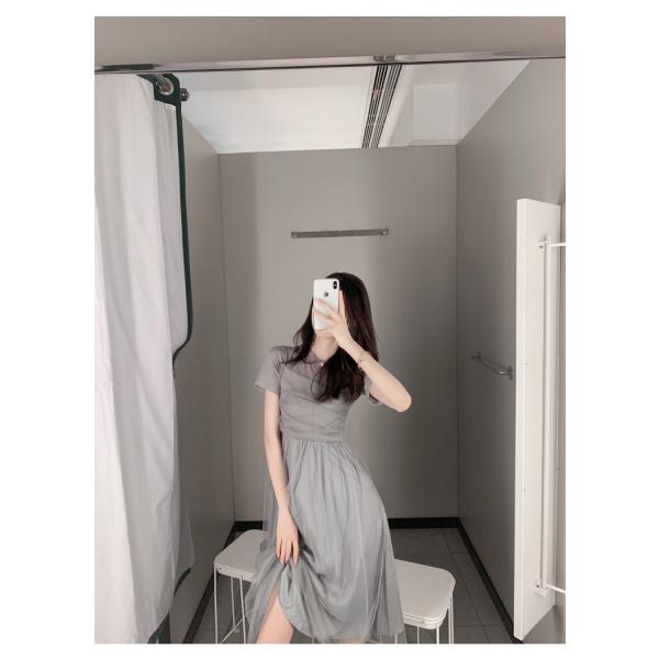 半袖 シフォン シースルー レース ドレス ロングワンピース グレー 袖あり 韓国風