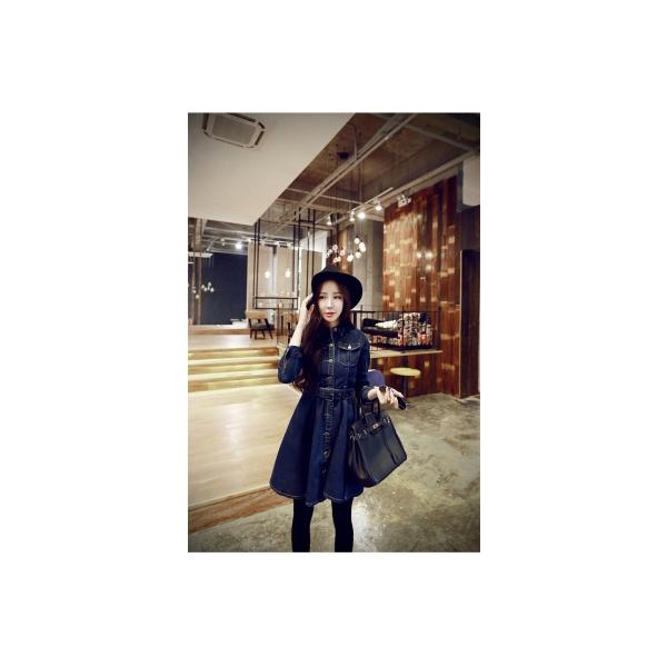 ワンピース チュニック ショート丈 ミニ丈 長袖 Aライン デニム シャツ カジュアル デニムワンピース 襟付き これ1枚 ベルト リボン 無地 濃いブルー 春夏