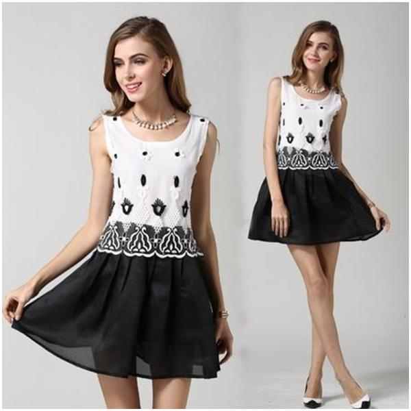 ワンピース チュニック ショート丈 ミニ丈 ノースリーブ フレア ドッキングワンピース モノトーン 花柄 刺繍 ウエスト 切り替え フレアワンピース 2017