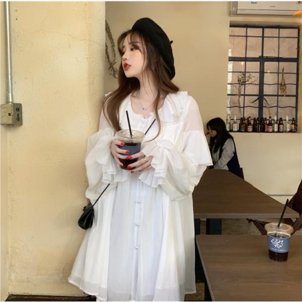 ワンピース チュニック ミニ丈ワンピース ゆるふわ シフォンを重ねたシャツチュニック ブラウス レース トップス 人気商品 送料無料