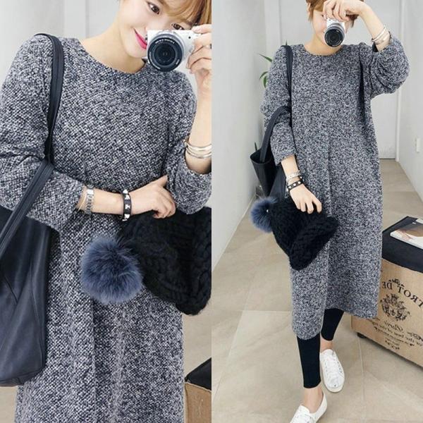 ワンピース チュニック ひざ丈 長袖 ミディアム丈 クルーネック 無地 カジュアル 長袖ワンピース ミディ丈 グレー シンプル 体型カバー ゆったり 秋冬