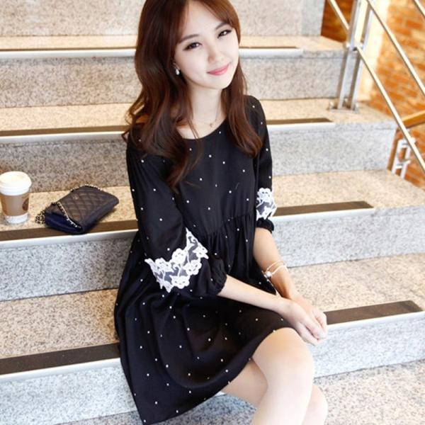 ワンピース ショート丈 ミニ丈 七分袖 ドット柄 花柄 レース ハイウエスト 切り替え ミニワンピース ガーリー 7分袖 スタイルアップ フレアワンピース 2017
