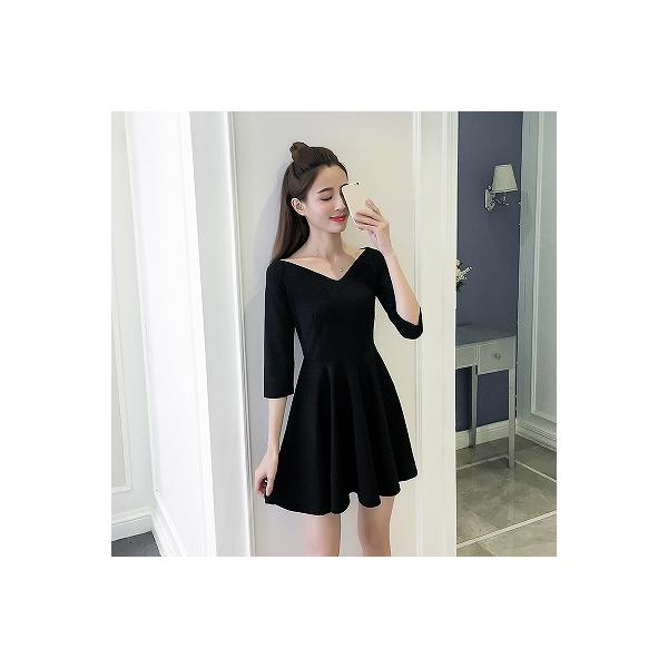 ワンピース ショート ミニ丈 七分袖 無地 モノトーン Vネック フレアスカート フォーマル 美脚 シック シンプル 結婚式 パーティー