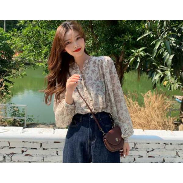 トップス ブラウス シャツ レディース 小花柄 花柄 ボリューム袖 ランタンスリーブ 透け感 フリル ガーリー かわいい カジュアル 清楚 10代 20代 30代 40代 春 秋 韓国 ファッション