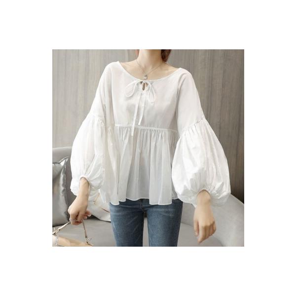 ガーリー 華奢見え かわいい ミディアム パフスリーブ ラウンドネック 袖コンシャス 無地 トップス ブラウス・シャツ 春夏秋