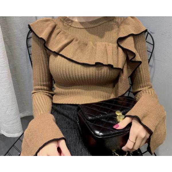 トップス リブニット レディース フリル フリル袖 スリム シンプル カットソー 韓国ファッション 秋 冬 ニットカットソー 人気 送料無料