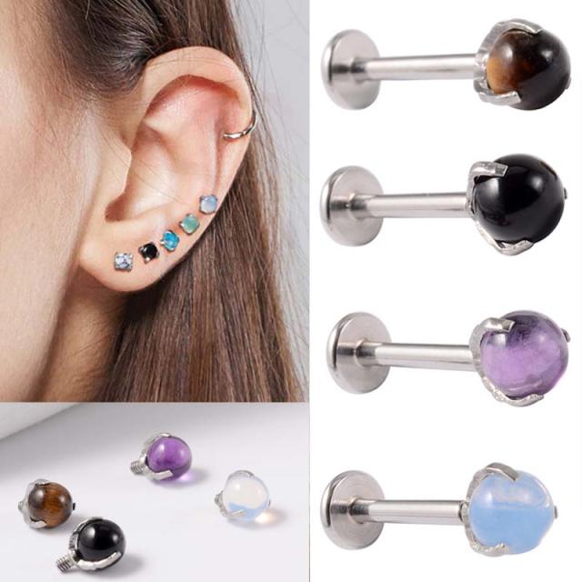高級感のある色合いの天然石風の丸いストーンが立て爪タイプのインターナルラブレットにセットすることで石の色合いを存分に堪能できるボディーピアスです。素材も安心のサージカルステンレス316L製。しかもシャフトにネジ穴のあるインタナリータイプなのでピアスホールを傷つけにくいので、ファーストピアスやセカンドピアスにも人気。石の色合いも様々あるので男性でも女性でも使えます。トラガスやヘリックス、ルークやコンク、アッパーダイスやアンテナヘリ、リップ(クチピアス)まで幅広く使えるボディピアス。メンズでもレディースでもジェンダーレスに使えるのでプレゼントやペアルックにもオススメです。