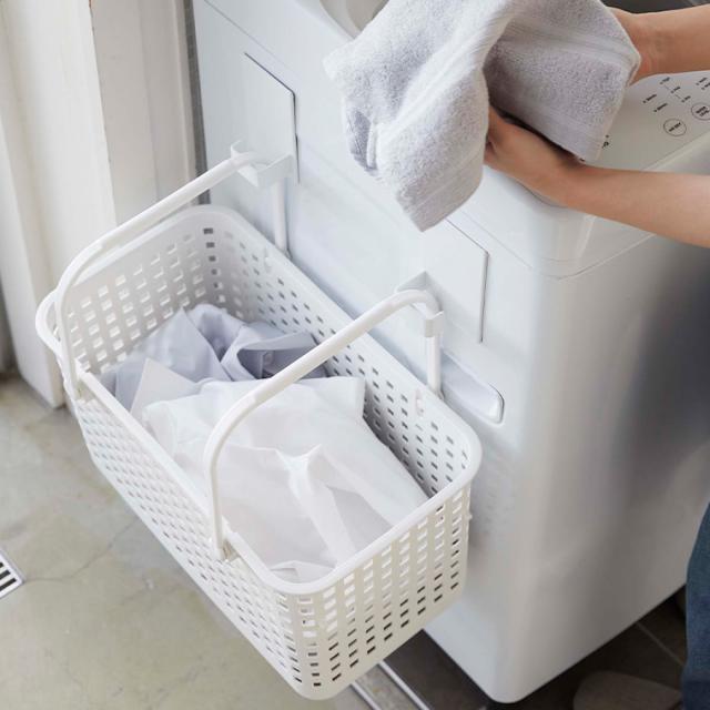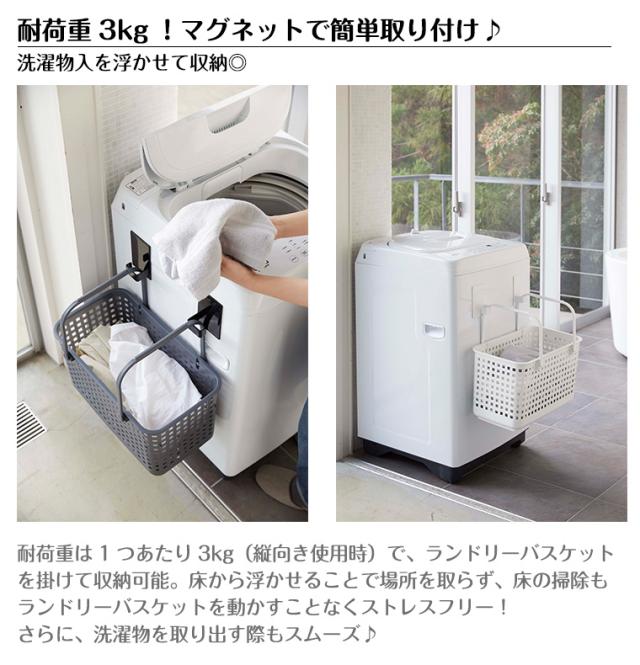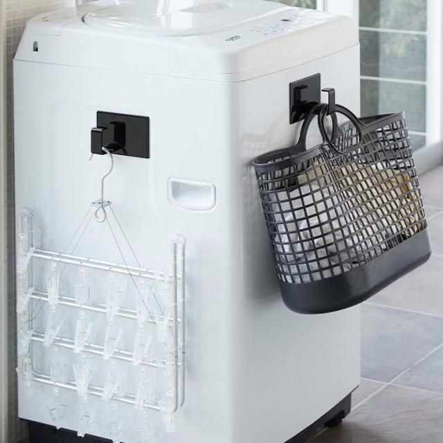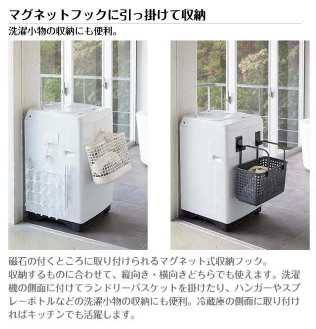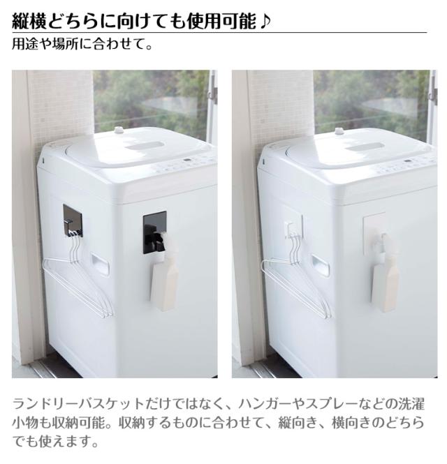 洗濯機の側面に付けてランドリーバスケットを掛けたり、ハンガーやスプレーボトルなどの洗濯小物の収納にも便利。冷蔵庫の側面に取り付ければキッチンでも活躍します。
