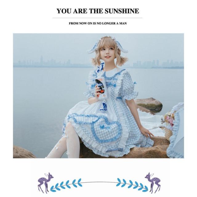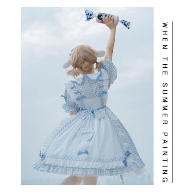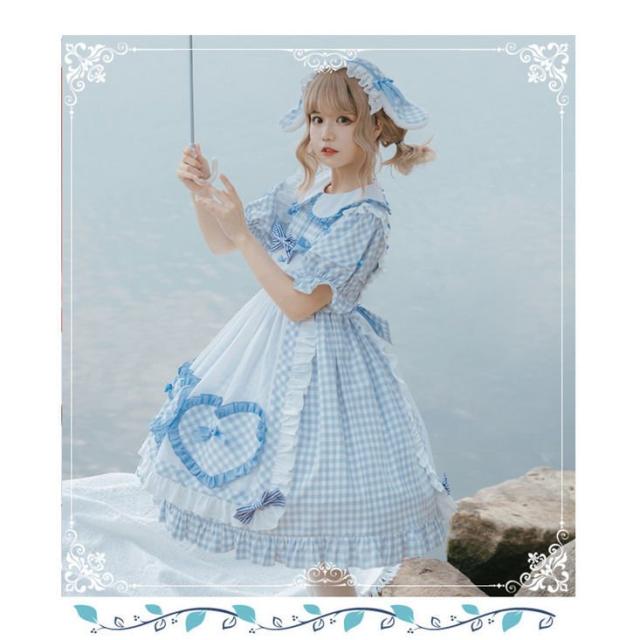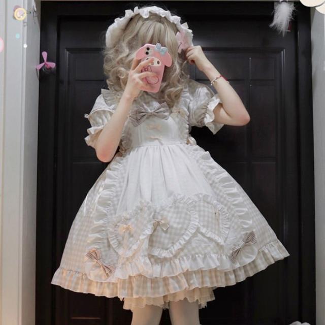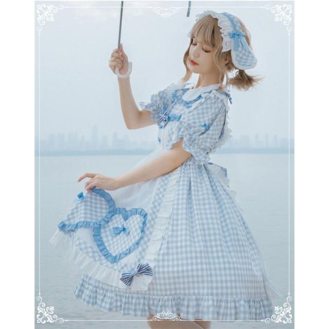 Lolitaワンピース レディース セットアップ 2セット トップス 少女 お姫様 フリル襟 レース 蝶結び付き エプロン 膝丈 ロリータ風