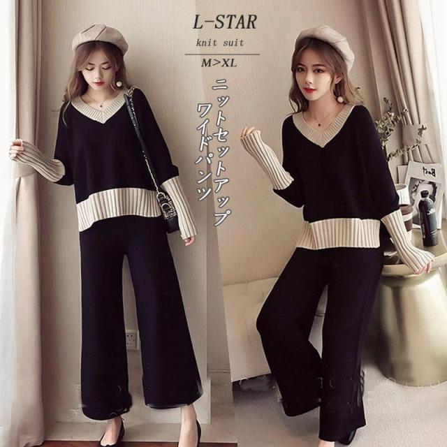 セットアップ レディース 秋冬 ニット パンツスーツ ニットセットアップ ゆったり トップス セーター Vネック ワイドパンツ オシャレ 30代 40代 コーデ