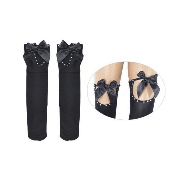 ストッキング ニーハイ もも丈 ガーター レディース リボン ラインストーン 単色 無地 シンプル 光沢 黒 ブラック おしゃれ