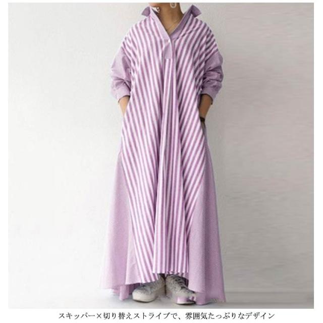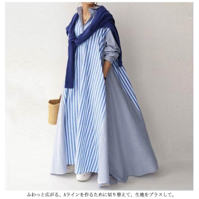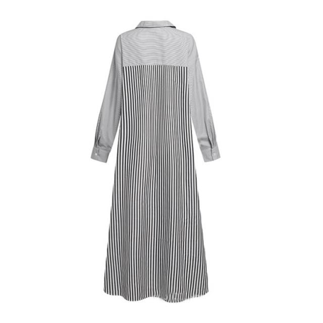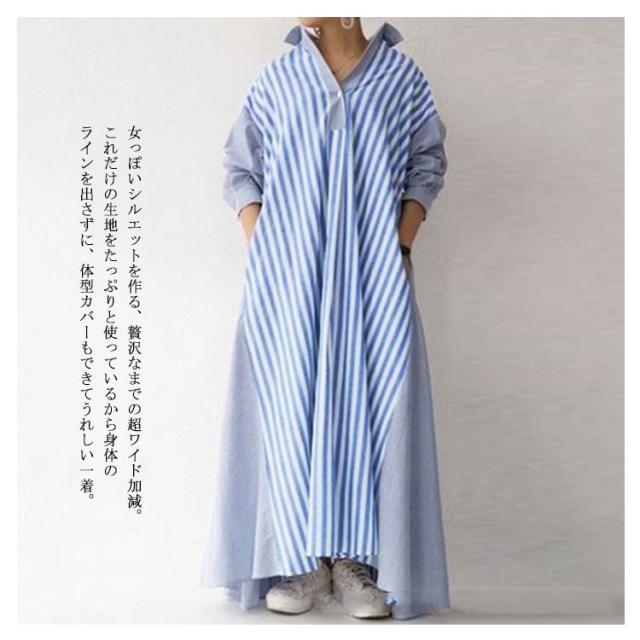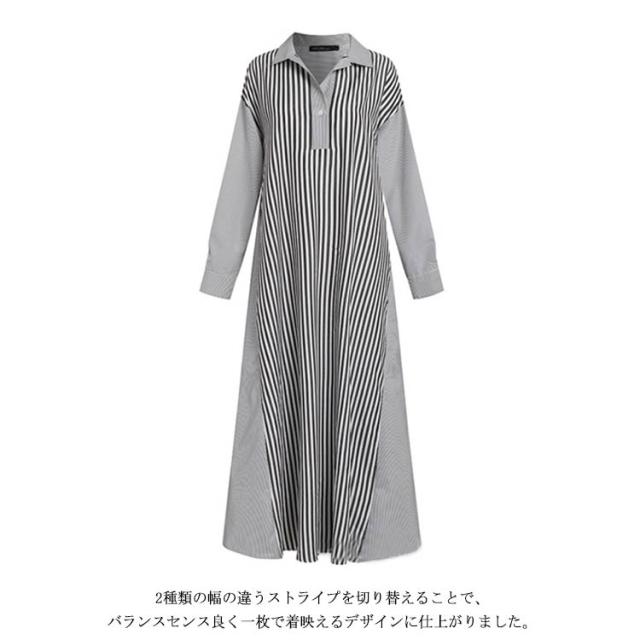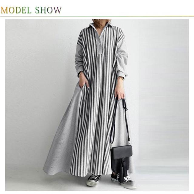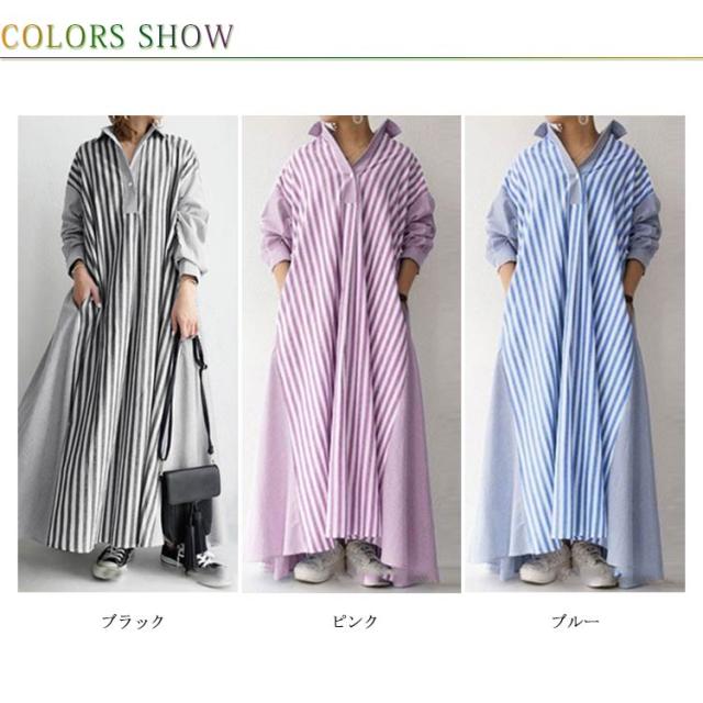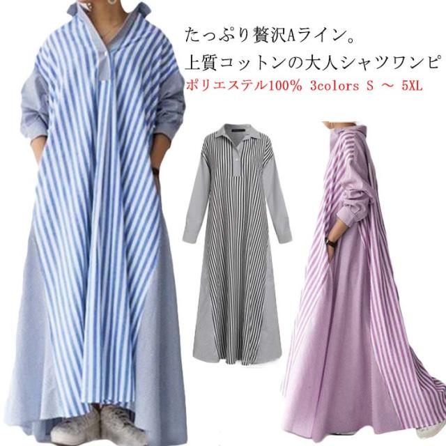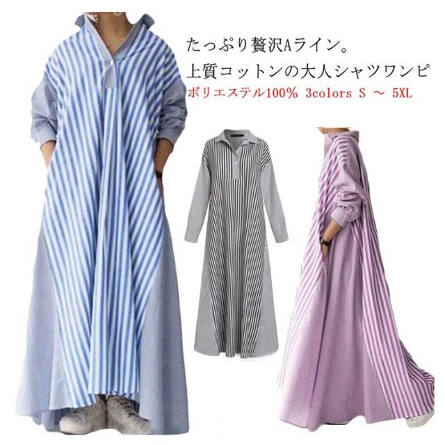 ストライプシャツワンピ 送料無料 長袖 黒 ワンピース レディース ロングワンピース Aライン ポリエステル100% ビッグシルエット 大人 お洒落 おしゃれ かっこいい ロングワンピ 切り替え コットン ゆったり 大きいサイズ
