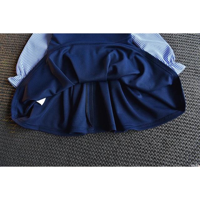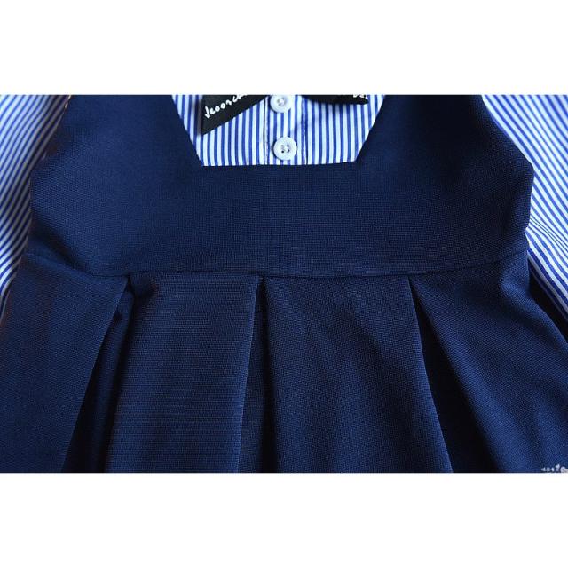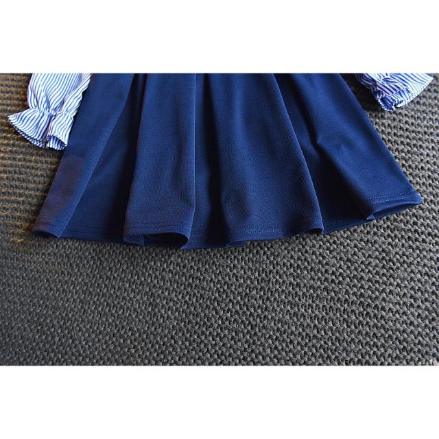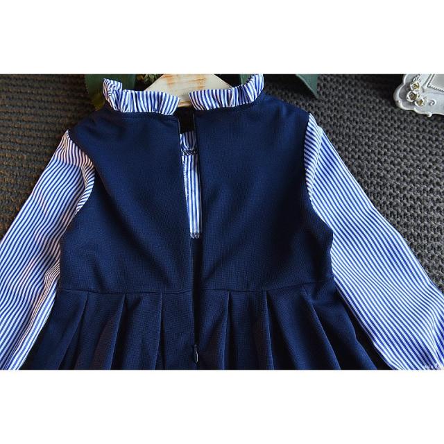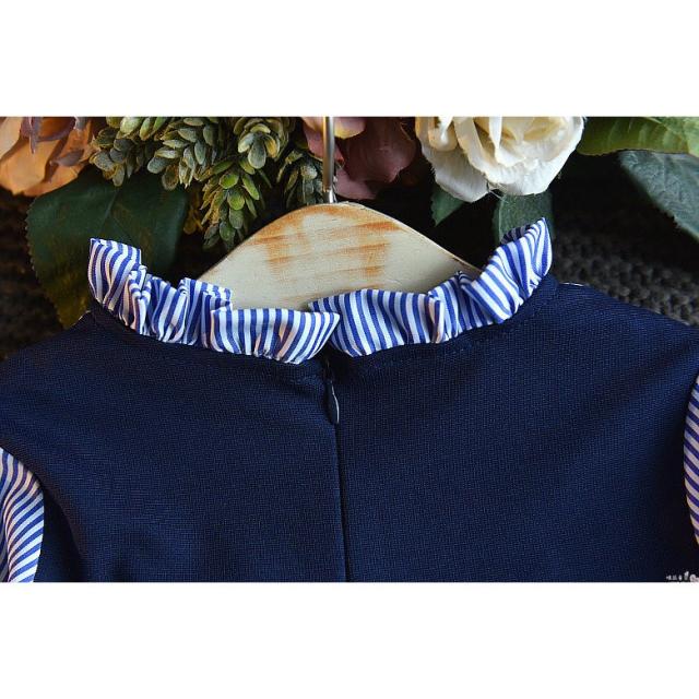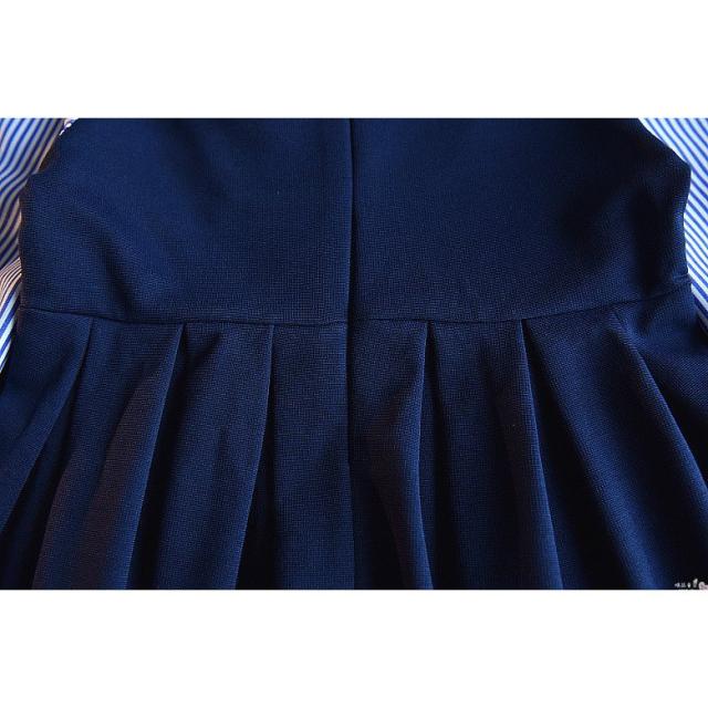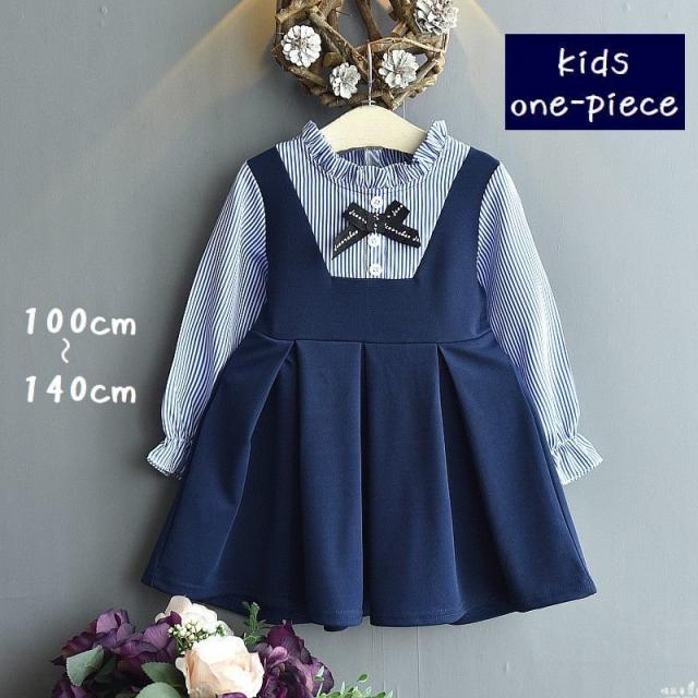 タックワンピース 長袖 子供 キッズ 女の子 重ね着風 膝丈 フリル襟 リボン 袖口ゴム ストライプ ネイビー 発表会 入学式 写真撮影 七五三 フェ