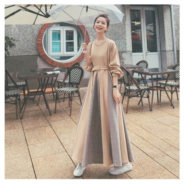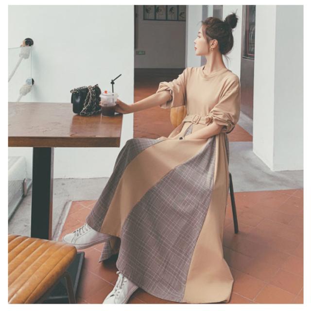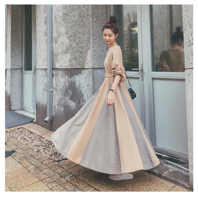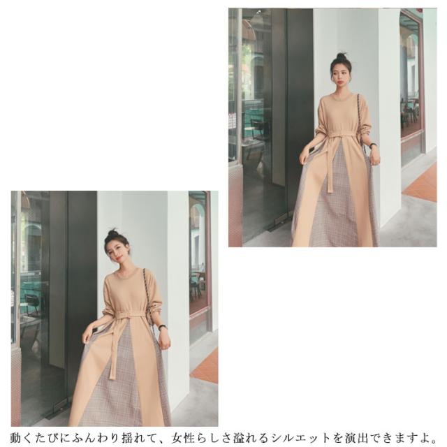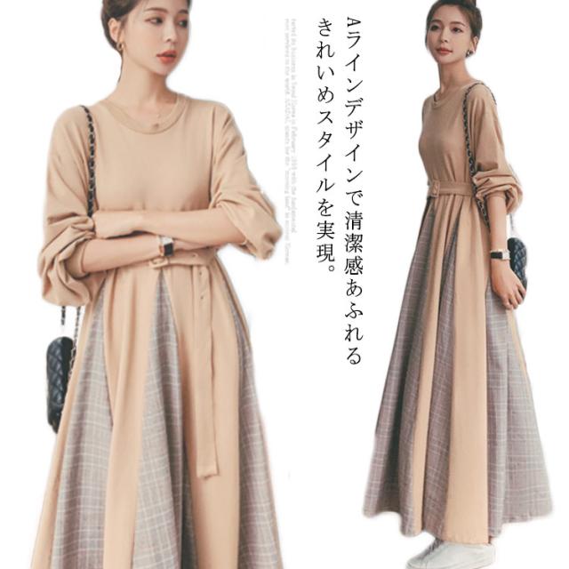 パーカーワンピ グレンチェック フレアワンピース 通勤 マキシワンピ 秋 Aライン クールネック チェック柄 切り替えワンピース 長袖 大きいサイズ 着?せ ベルト付 冬 OL ロングワンピース