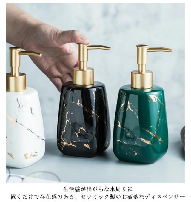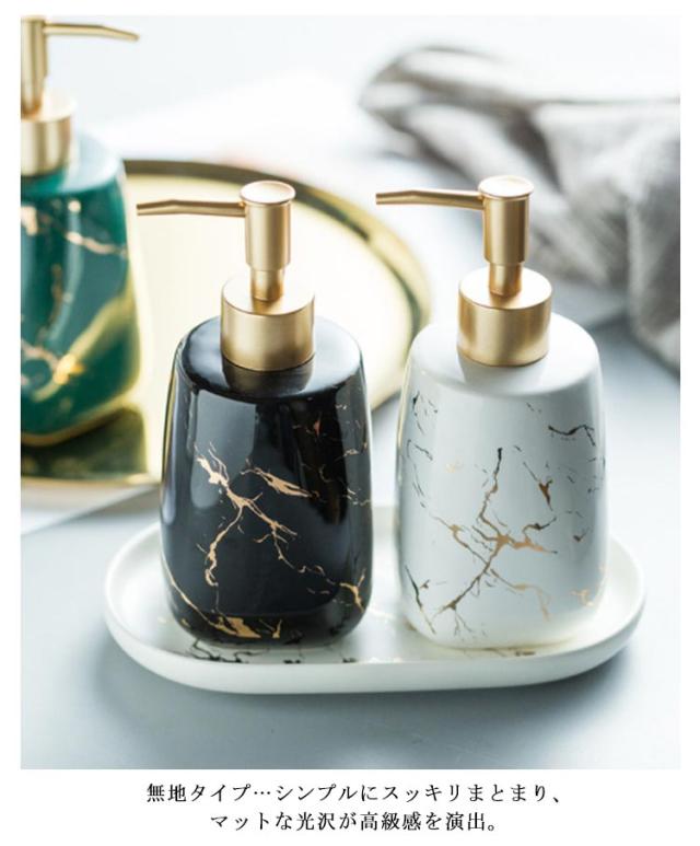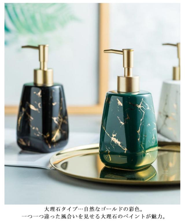 | 生活感が出がちな水周りに 置くだけで存在感のある、セラミック製のお洒落なディスペンサー 市販の液体ハンドソープをはじめ、 シャンプーやトリートメント、化粧水や乳液などでもご使用いただけます。 洗面台だけでなく、化粧台、お風呂場にもなじむデザイン性の高い商品です。 大理石タイプ…自然なゴールドの彩色。一つ一つ違った風合いを見せる大理石のペイントが魅力。 無地タイプ…シンプルにスッキリまとまり、マットな光沢が高級感を演出。 | |