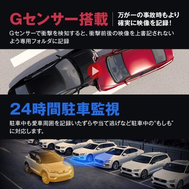 【駐車監視&Gセンサー搭載】ドライブレコーダーの内蔵バッテリー搭載によりエンジンを切った後も駐車中に衝撃を感知すると自動で録画を開始します。運転中でも駐車中でも安心出来るのが心強い。また、Gセンサー機能を搭載しており、運転中に車の衝撃を検出した場合、自動で録画を始まります。 さらに、衝撃前後の映像を上書きされないように自動的にフォルダをロックして記録を保存してくれます。