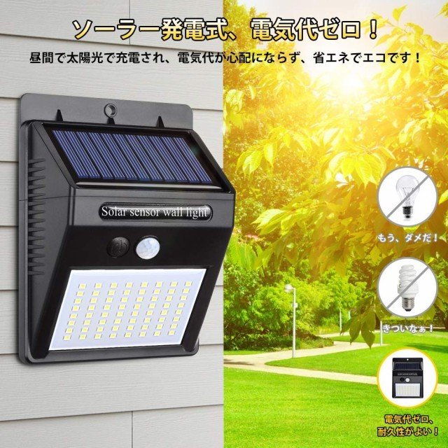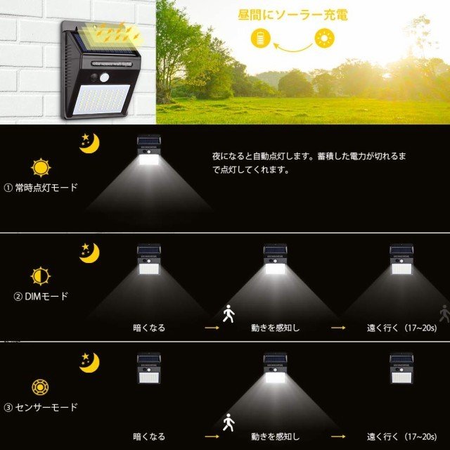 【ソーラー発電で省エネ&取付簡単】 本製品のソーラーパネルは昼間に太陽光で充電され、ソーラーエネを吸収し、夜になると自動点灯します。エコで電気代もゼロ!配線無し、電池はいらず、簡易に設置できます。