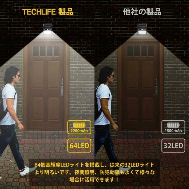 【2個セットの高輝度64LEDソーラーライト】 2021最新版ソーラーセンサーライトは、高輝度の64LEDライトを備え、2200mAhの大容量電池内蔵、従来品より明るくなり、照明時間10時間でき、照明角度も最大150°に達し、照明の範囲がより広いです。