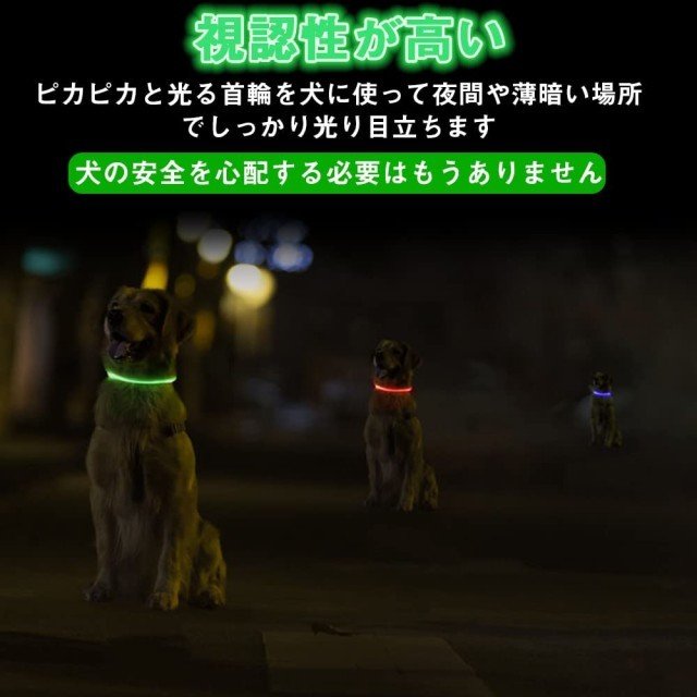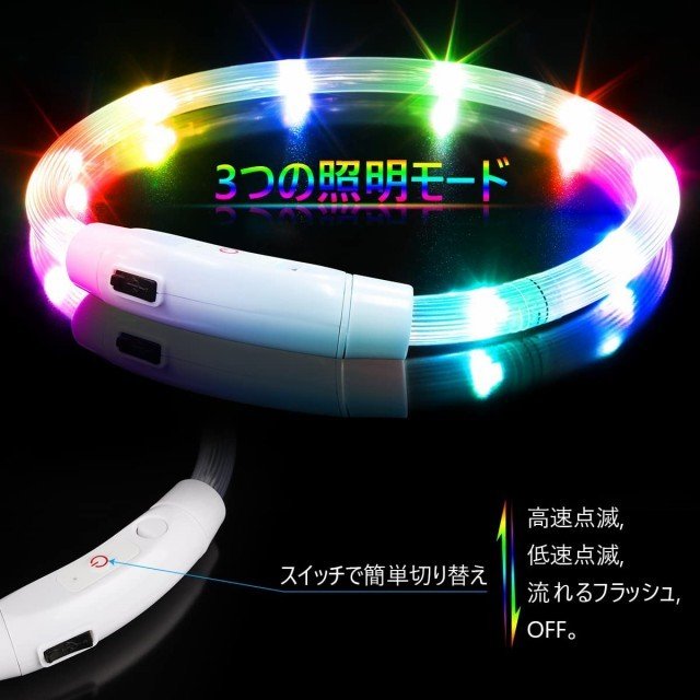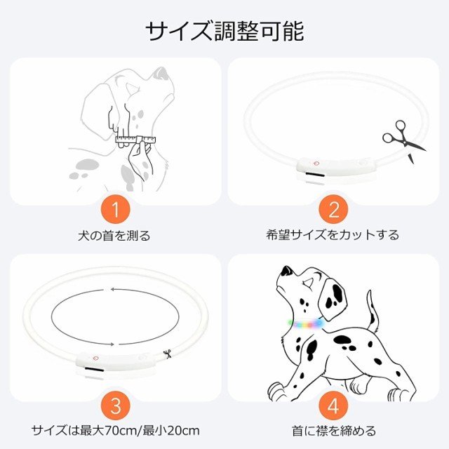 犬用光る首輪 発光首輪 柔らかい 軽量 サイズ調整可能 ペット 犬 猫 LED光る首輪 安全対策 視認性 4つの発光モード (七彩) 長さ調節 ペット 首輪 夜 安全 散歩