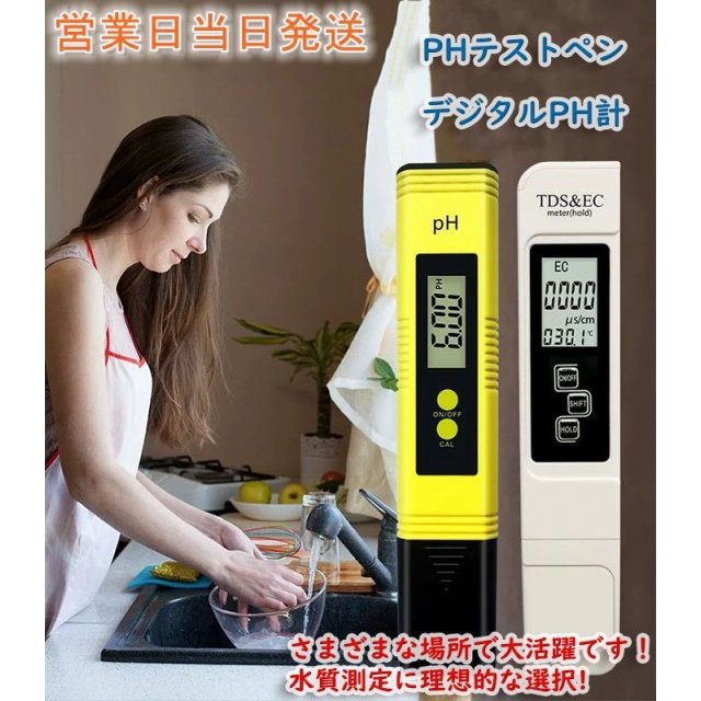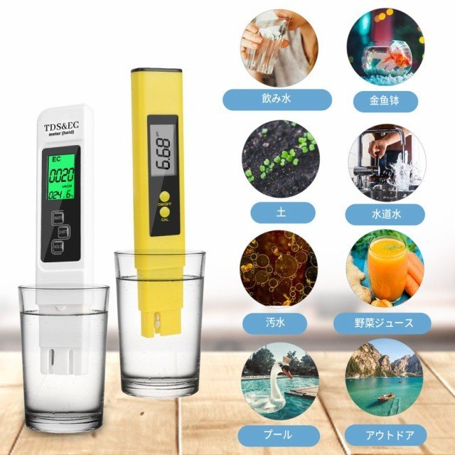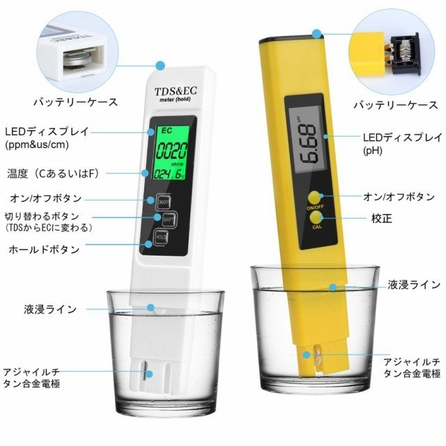 「PH計と水質TDS測定ペンセット」PH計は0-60℃の温度で使用可能、デジタル測定範囲は0.0-14.0PHで、誤差±0.01ph、分解能0.01 pH。TDS測定ペンは0.1 - 80.0℃の温度で測定範囲は0-9999 ppm。導電率:0-9990us/cm、誤差:±2%。ポイント:TDSメーターには自動温度補正の機能があり、測定値は水温の影響を受けず、気温の影響を受ける