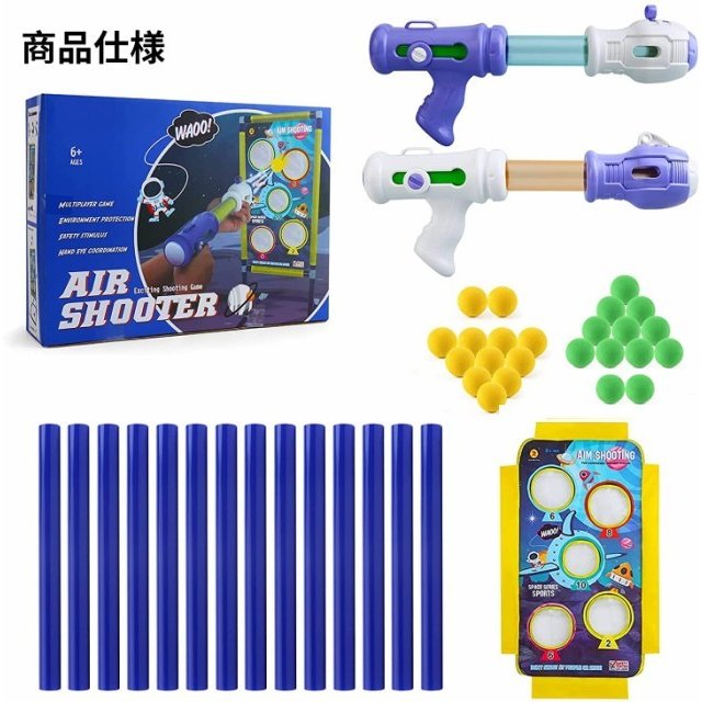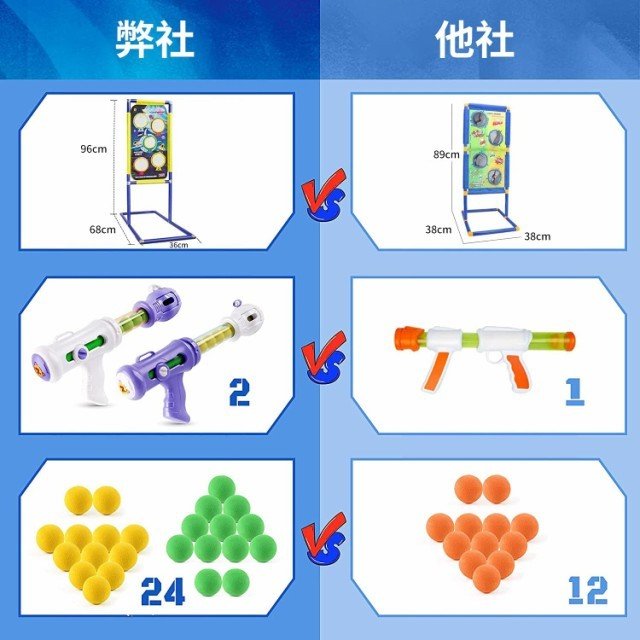 面白いおもちゃ:このおもちゃ銃セットは2本ポッパーガン、24個スポンジ弾と1つ的あてがあります。スペーステーマの的あては子供に人気です。ターゲットの表面には、高さとサイズの異なる5つシューティングホールがあり、シューティングゲーマの面白さが増しています。お一人で遊べるのはもちろん、家族やお友達と対戦して楽しむことも可能です!みんなが集まるイベントで射撃大会を開いてみましょう!