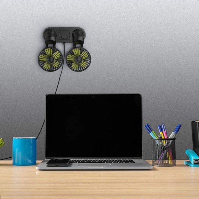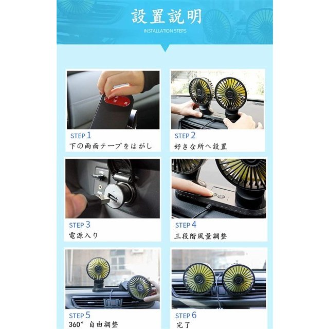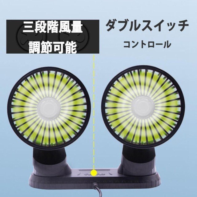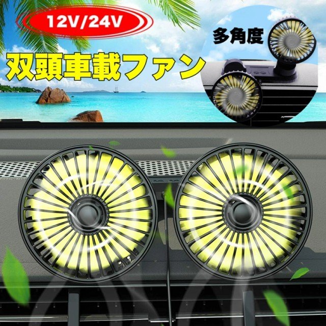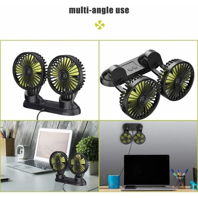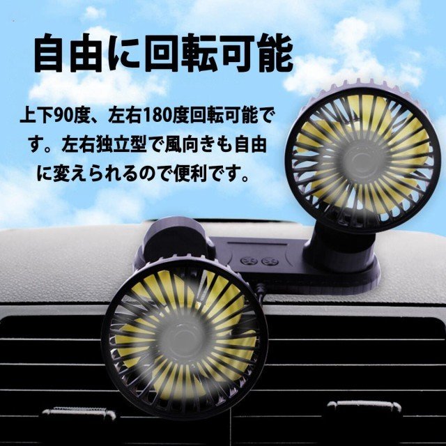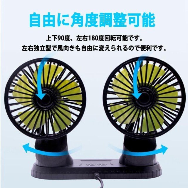 【角度自由調整可能・エアコン冷却効率向上】2つのファンはそれぞれ上下360°左右手動自由に調整でき、片方を運転席後ろへ、もう片方を助手席後ろへ風も涼しい風をシェアできます。車内のエアコン冷却効率をグーンと高めて車内の空気が巡回されてどこまでも涼しさを感じられて快適になります
