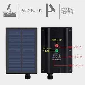 【大容量バッテリー】連続点灯20時間(最大)。充電池の容量を大きく(1500MAH)することで、ソーラー照明に良くある声「点灯時間が短い」を解消。さらに充電池の種類もランクアップ(18650 リチウムイオン充電池)させることでLEDの明るさを従来品より明るくしています。【高速充電 大型パネル】太陽光の変換効率が高い(17.8%)高品質パネルを採用。さらに大型化することで従来品より高速での充電(約4倍)を可能としています。(フル充電時間(約):6〜8時間 ※環境により充電時間は変わります。)