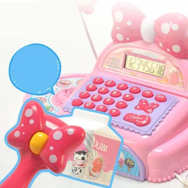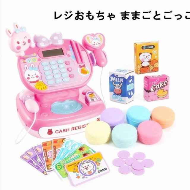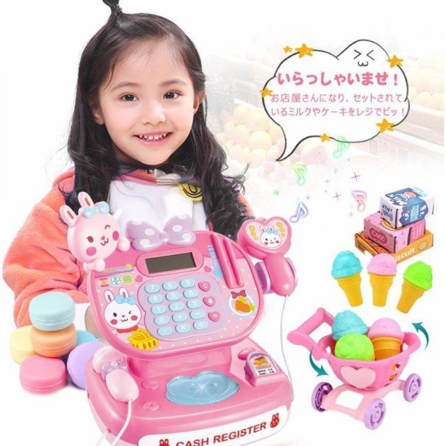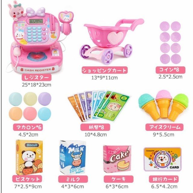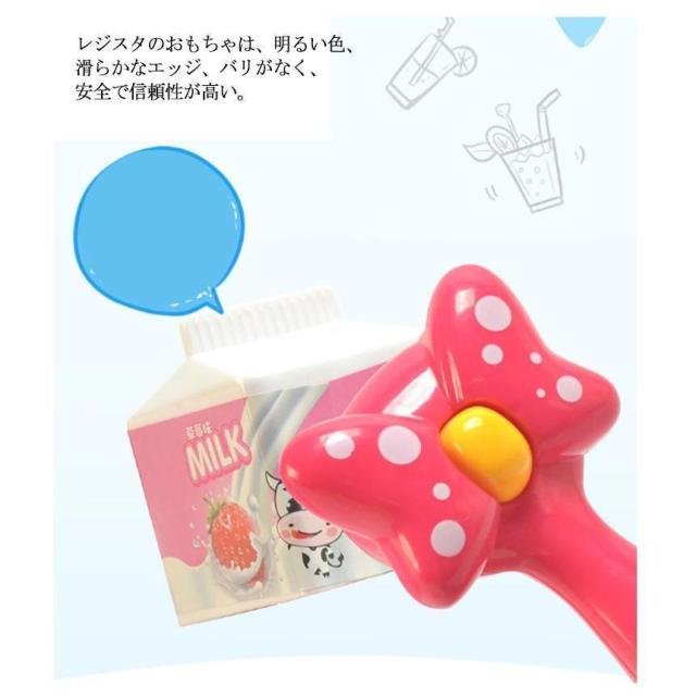 お店屋さんになり、セットされているミルクやデザートをレジでピッ!ピッと商品をスキャンしたり、商品の合計額を計算したり、シールを小物や他のものに貼って、、意外と脳や指先を使う作業になり脳に良い刺激となります。お子様が本来持っている創造力 考える力 五感 好奇心を刺激し、育むことができる知育玩具。また、お店屋さんごっこを遊びしよう。遊びながら学習でき、知育に役立つおもちゃ
