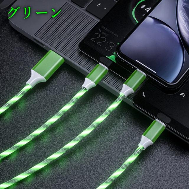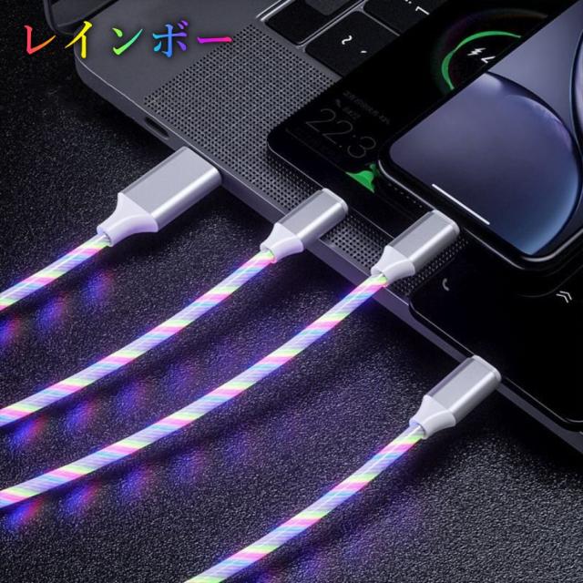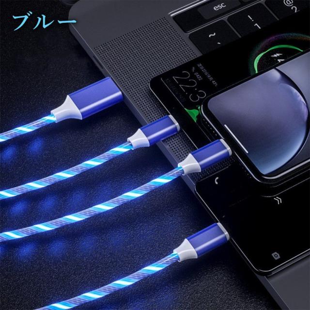 光る充電ケーブル Lightning Type-C microUSB 充電コード おしゃれ 車載 アクセサリー イルミネーション ライト 夜光 ライトニング タイプA タイプB タイプC 充電ケーブル レインボー ブルー グリーン レッド 4色 3台同時に充電 3in1 送料無料