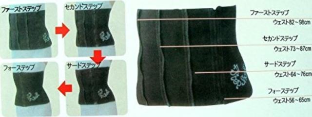 【4段階切換】:(1ステップ:ウエスト82cm〜98cm、2ステップ:ウエスト73cm〜87cm、3ステップ:ウエスト64cm〜76cm、4ステップ:ウエスト56cm〜65cm)