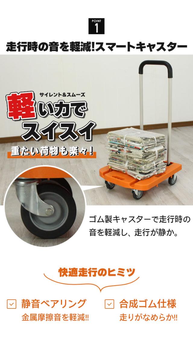 騒音が少なく、動きがスムーズなキャスターを採用した折りたたみ式台車です。